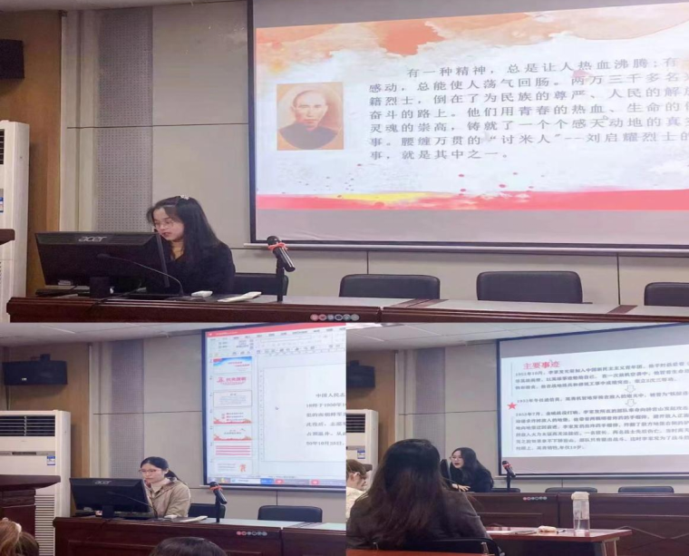 在活动中,曲博宇、周颖和陈晨等三位积极分子代表依次以PPT形式向大家讲述先烈事迹。屈博宇同学讲述了安徽省南陵县抗美援朝志愿军李家发的事迹,他在战争中英勇机智地穿梭在敌人的炮火中,被誉为“铁腿通信员”。今年是中国人民志愿军抗美援朝出国作战71周年,周颖同学带领大家一起缅怀了杨根思、许家朋等先烈,并阐述了抗美援朝的意义所在。陈晨同学则讲述了腰缠万贯的“讨米人”刘启耀的故事。