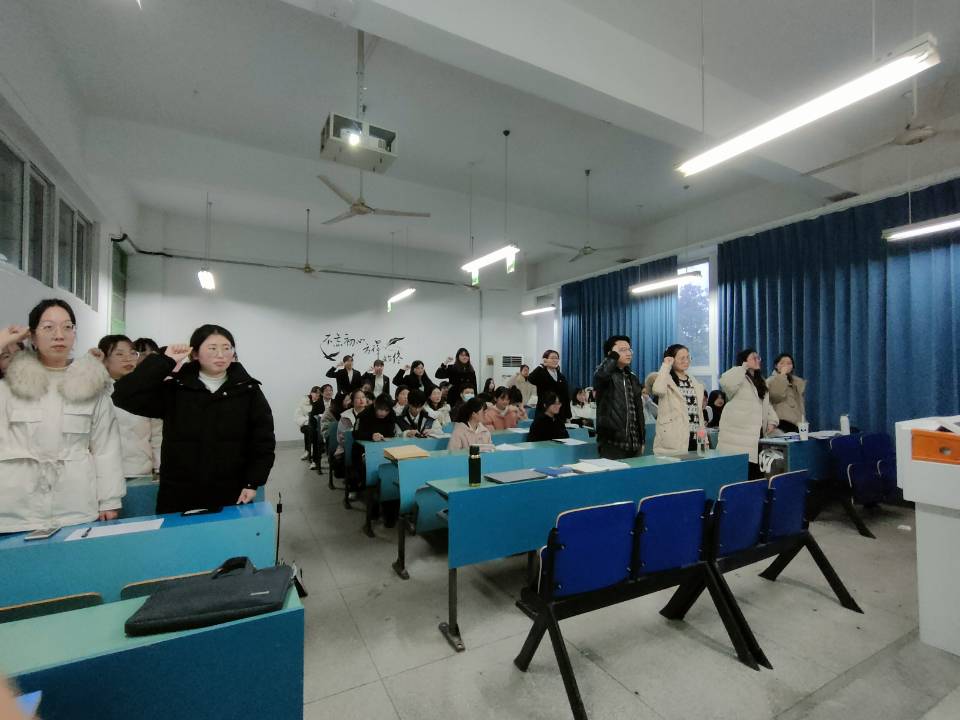 会议第三项,入党介绍人盛亚琴就上述十二位申请转正同志在预备期间的表现情况进行评价,关切党员同志学习生活,表示考研同学要把握好心态,就业同学要多积累实习经验,作为党员同志也需要主动承担党的责任与担当,找准自身定位,为他人服务,向考研以及就业的同学表示了自己衷心的祝福,最后对其能否转为正式党员表明意见。会议第四项,有表决权的正式党员对张馨越等十二位同学能否按期转正进行投票表决。会议第五项,刘胡海宣读大会决议,十二位转正申请人全票通过,建议按期转正,报请上级党组织批准。会议最后一项,由缪莹莹同志带领党员同志们面对党旗,庄重宣读入党誓词,表明自己的入党决心。