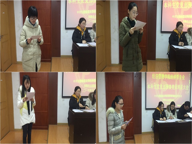 党支部书记甘伟老师首先就本次大会相关事宜和会议流程进行了相关说明。随后4名转正预备党员依次上台汇报了自己的思想情况。接着,入党介绍人张珍、江涛等同志分别对4位预备党员的主要情况和其培养教育情况进行汇报;支委会也向支部大会报告了对4位预备党员的审查情况,对其日常表现等做出了评价与鉴定,纪律委员曹娅男向大会报告了对申请人的审议情况。随后的环节中,与会党员充分发表了对各位预备党员按期转正的意见,对预备党员在预备期间的思想、学习、工作等情况向大会作出说明,肯定优点,指出缺点,并提出希望。经党支部投票表决,一致同意虞晓飞、石苗苗、胡瑜洁、张玥萌4位同志按期转为中共正式党员。