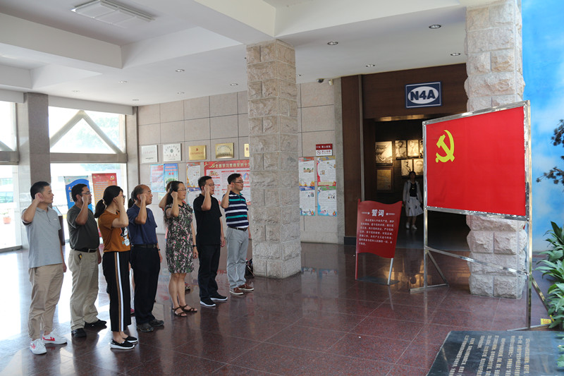 茅山新四军纪念馆建筑独特,占地面积约16000平方米,馆内展出各类实物及图片3000余件,采用声、光、电等高科技手段,生动展示了当年新四军奋起抗日的英勇场面。在新四军纪念馆,党员及领导干部们通过图片、实物等史料再次目睹了日本军的残暴以及新四军在苏南根据地所开展的英勇斗争,深受教育。在公司党委副书记李海燕的领誓下,党员及领导干部们重温了入党誓词。