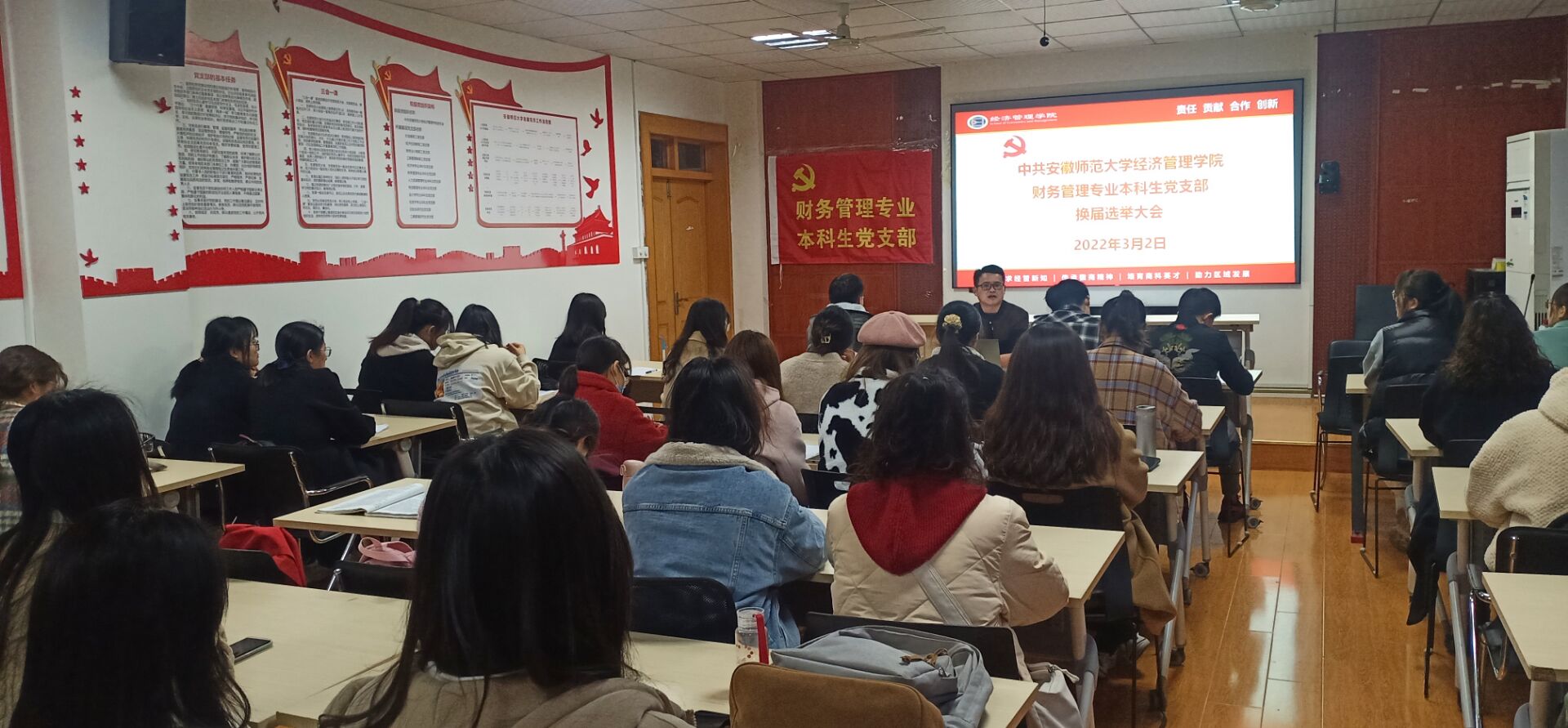 经公司党委研究决定,调整新成立财务管理本科生党支部,原支部支委调离党务工作岗位,经组织党员对缺额支委候选人初步人选进行了推荐、酝酿,3月2日18:00,财务管理本科生党支部大会在公司一楼报告厅召开支部换届选举大会,会议由支部书记甘伟主持。