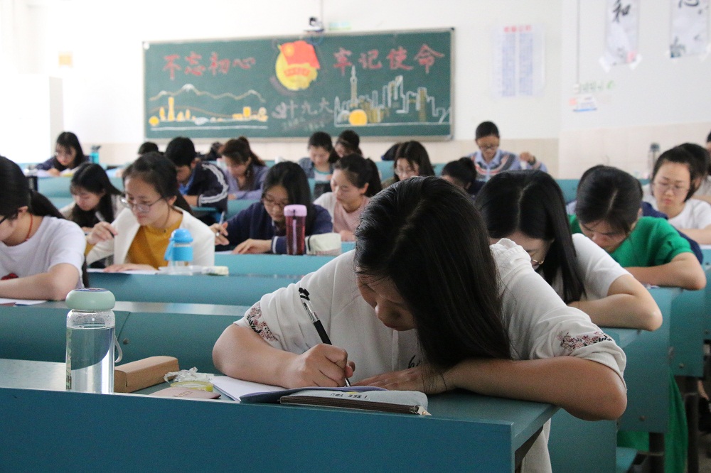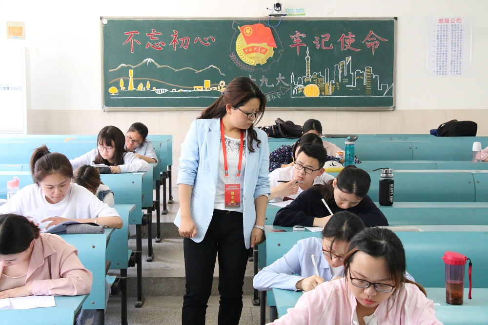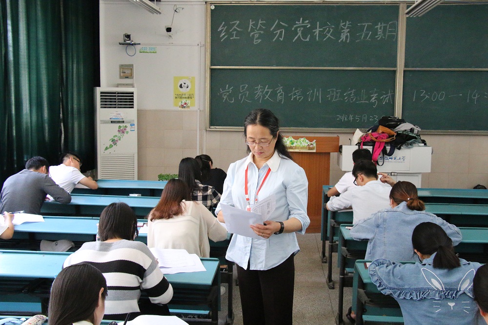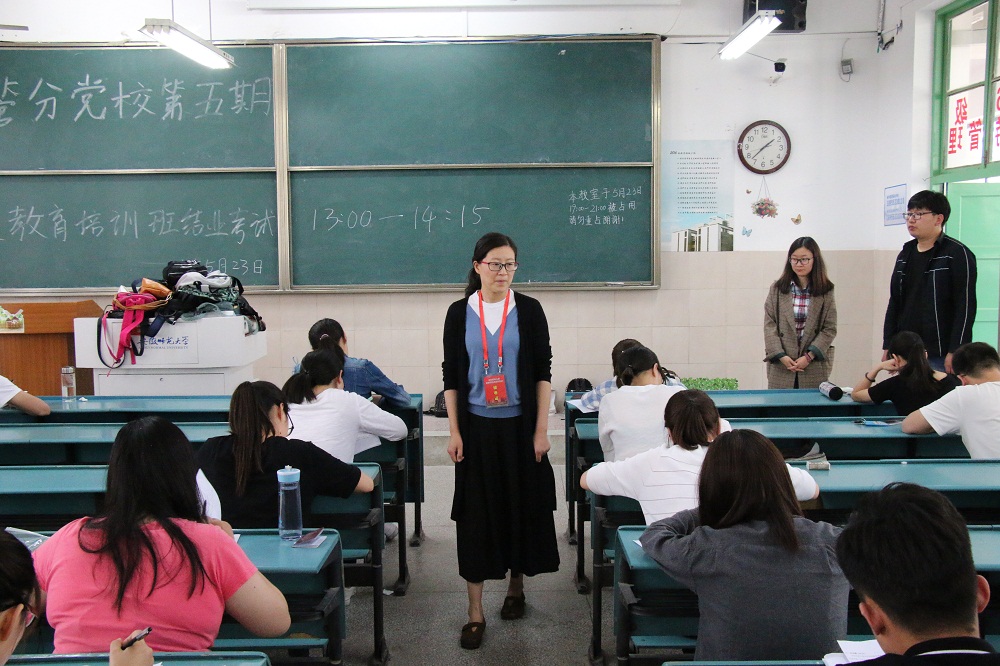 在考试正式开始前,学员们按照监考老师的指令,把相关证件摆放在桌面上,以便监考老师核实身份信息。另外,学员们将所有的书本等与考试有关的资料上交,将手机关机放进书包,一并放在讲台上。学员们拿到试卷后,开始认真答题。本次考试的题型多样,分为填空题、单项选择题、多项选择题、判断题、简答题和论述题。考试内容围绕十九大报告、最新党章以及党支部建设特色活动的意见和建议展开,充分考察了学员们对党规党章的了解程度以及将理论知识转变为实践运用的能力。