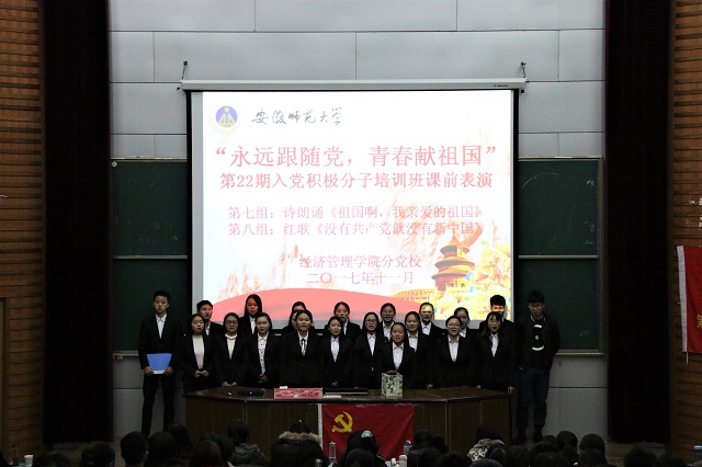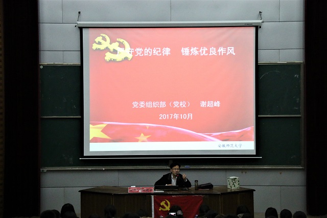 在第七组诗朗诵《祖国啊,我亲爱的祖国》和第八组红歌《没有共产党就没有新中国》的课前预热下,党委组织部副部长谢超峰从“国际共产主义运动概况”、“中国共产党的挑战与机遇”以及“严守党的纪律,锤炼优良作风”三个方面向学员们进行正式地讲解。