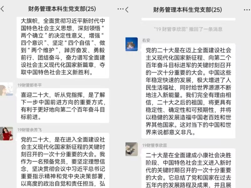 2022年10月16日,中国共产党第二十次全国代表大会在北京人民大会堂隆重开幕。习近平同志代表第十九届中央委员会向大会作报告。m88官网财务管理专业本科生党支部组织全体党员同学线上集中收看党的二十大开幕会,并第一时间以多种形式开展交流研讨,深刻学习领会党的二十大精神。
