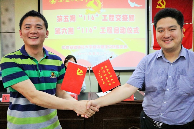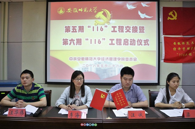 首先,2012级本科生第二党支部书记汪诚老师对第五期“116工程”进行总结,12级员工党员工作情况得到了院里领导的持续关注、悉心指导和多项支持,党员们积极对接新生,主动帮扶,使得新生学习生活中的大部分问题都得到了解决。第五期“116工程”学员代表2012级人力资源管理专业李晶晶同学发言,分享了在帮扶工作中的经验与感悟,“学”固然重要,但更关键的是“做”,今后也会不断努力,将自己所学运用到实践中,帮助更多人。随后,2013级本科生党支部书记汪华伟老师对第六期工作进行介绍与布置。“116”工程第六期将从“做朋友、做帮扶、做引导”着手,与“两学一做”学习教育相结合,通过活动引导新生和高年级员工党员们不断提高自身的理论素养,在实践中践行“两学一做”。第六期“116工程”学员代表2013级本科生党支部组织委员王振龙同志作表态发言,后续会积极主动为低年级同学排忧解难,并通过寝室互访、建立网络群组等多种方式保持与学弟学妹们的联系,为他们的老员工活保驾护航。之后,2012级员工第二党支部书记汪诚老师与2013级党支部书记汪华伟老师进行了“116工程”旗帜交接。公司党委副书记李海燕在总结中强调:“116工程”在前五期工作中取得了很好的成效,希望“116”工程第六期的员工党员要积极主动提升自己的理论素养,积极帮扶自己对接的低年级同学,并希望党员同学要精心组织,发挥党支部的堡垒战斗作用;要以身作则,发挥党员的模范带头作用;要勇于创新,永葆共产党员的生机和活力。交接仪式在掌声中顺利结束。
