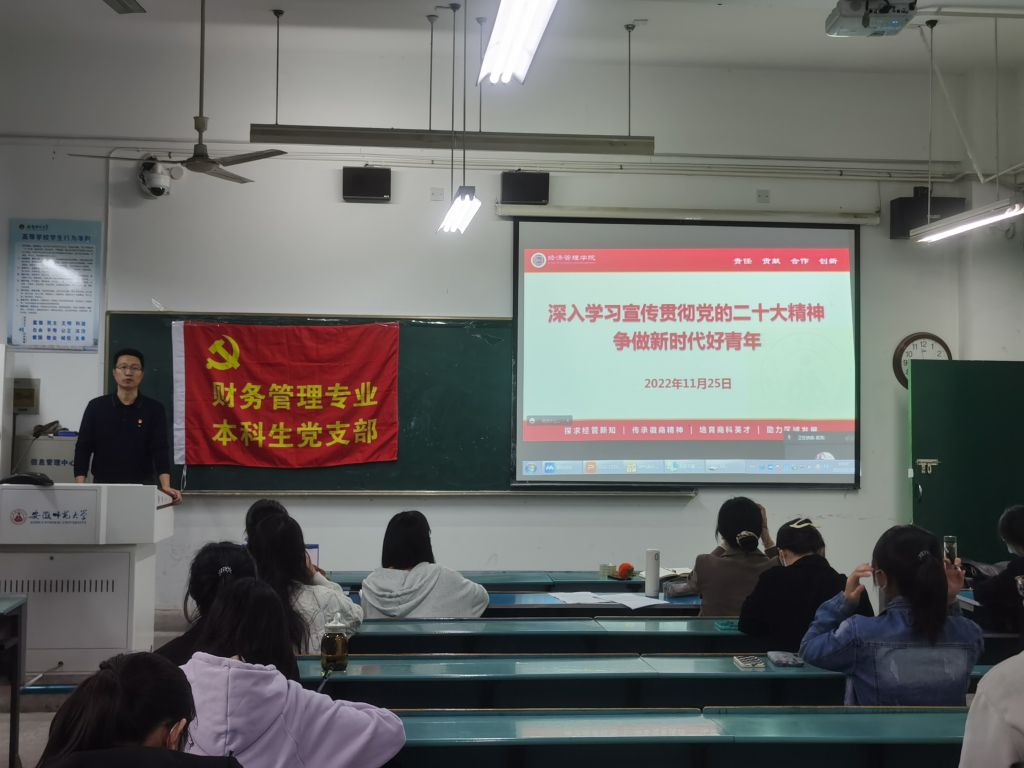 新思想引领新时代,新使命开启新征程。为深入学习贯彻党的二十大精神,动员和激励青年党员切实把思想和行动统一到以习近平同志为核心的党中央重大决策部署上来,11月25日,公司党委副书记陈刚锋为公司四个本科生党支部讲授“深入学习宣传贯彻党的二十大精神,争做新时代好青年”专题党课,m88官网本科生党支部全体党员以线上、线下相结合的方式聆听了此次党课。本次党课主会场设在财务管理专业本科生党支部,由支部书记于琼主持。