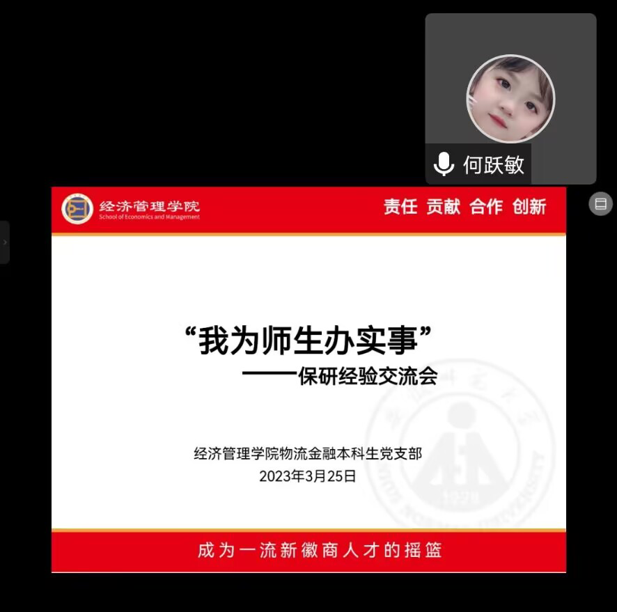 为加强支部交流,促进党员进步,m88官网物流金融本科生党支部于3月25日晚上7点在腾讯会议线上召开保研经验交流会,本次交流会邀请到杨媛媛、何跃敏等四位同学进行保研经验的分享,参会人员为正在为推免工作做准备的大三同学。