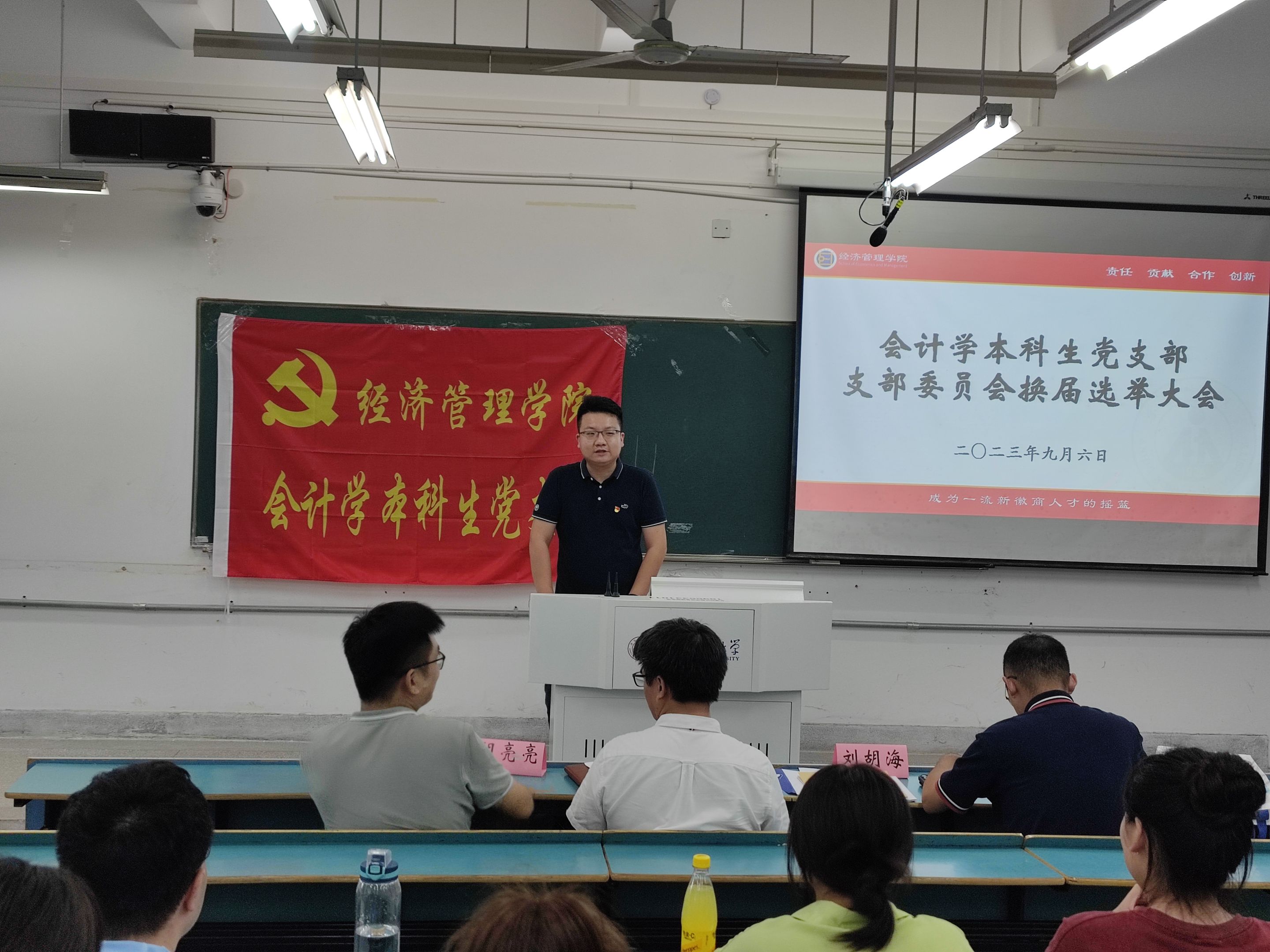 9月6日下午,会计学本科生党支部在教学楼7号楼101教室举行支部委员会换届选举大会,讨论支部委员会换届问题,大会由刘胡海主持。
