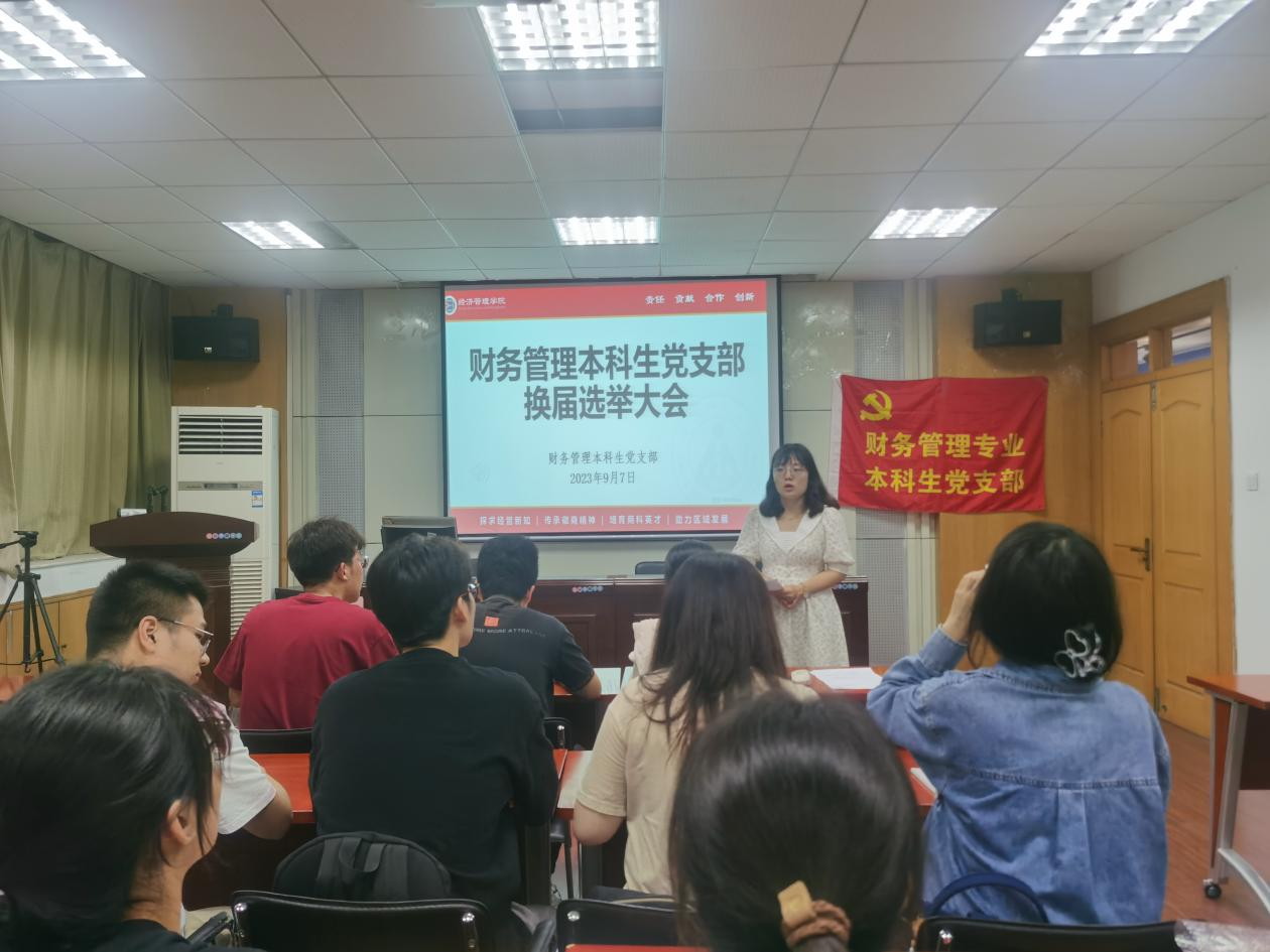 本网讯(财务管理本科生党支部 徐伟杰,关杰)为健全和完善党支部组织建设,增强支部活力,财务管理本科生党支部于2023年9月7日在m88官网行政楼二楼报告厅召开支部换届选举大会,选举李佳颖同志为支部书记,韩艳梅、关杰、赵龙同志为新一届支部委员,党支部全体党员参会。