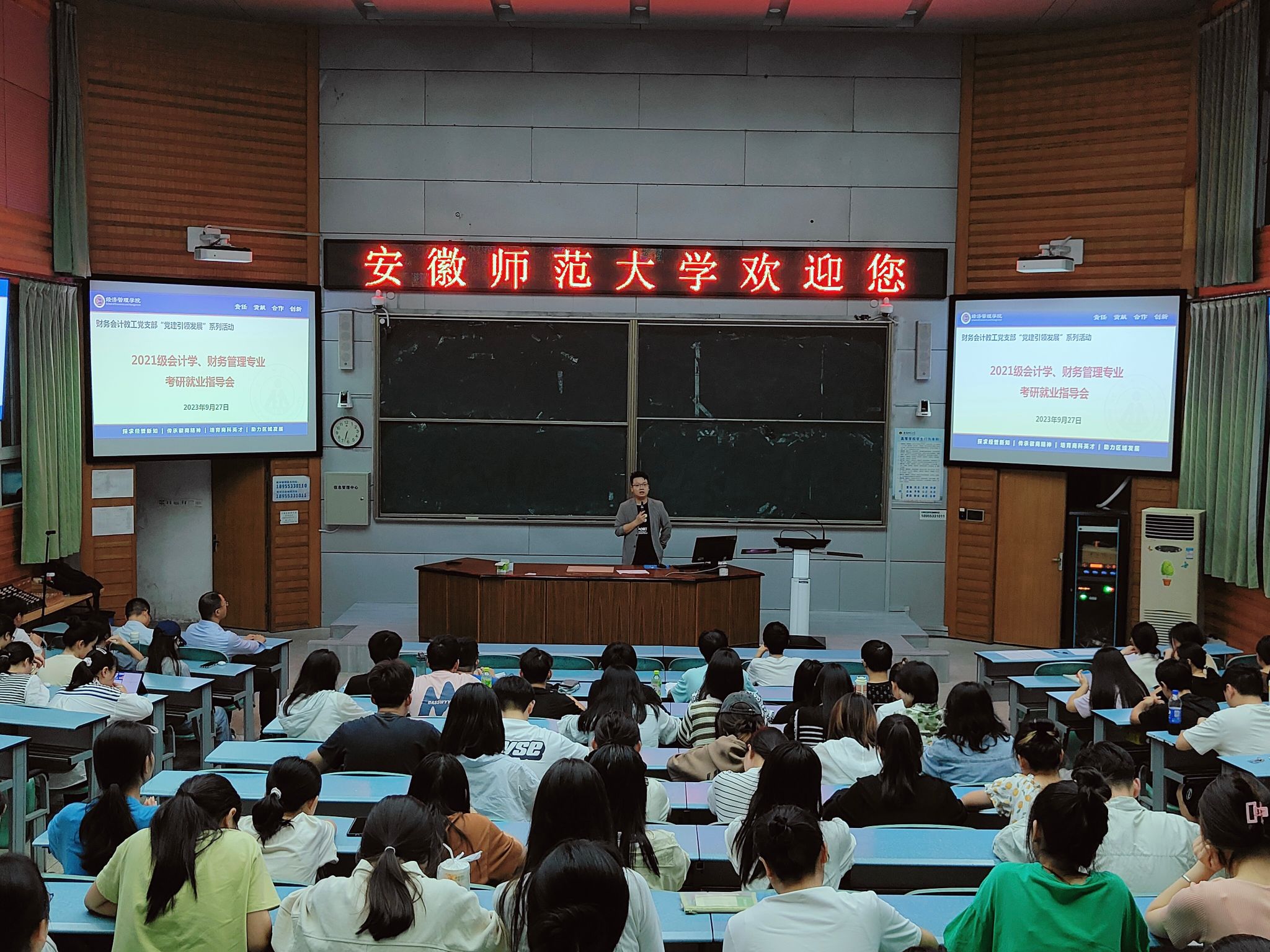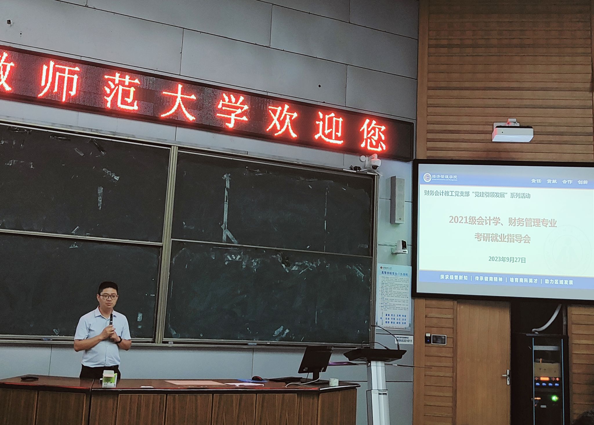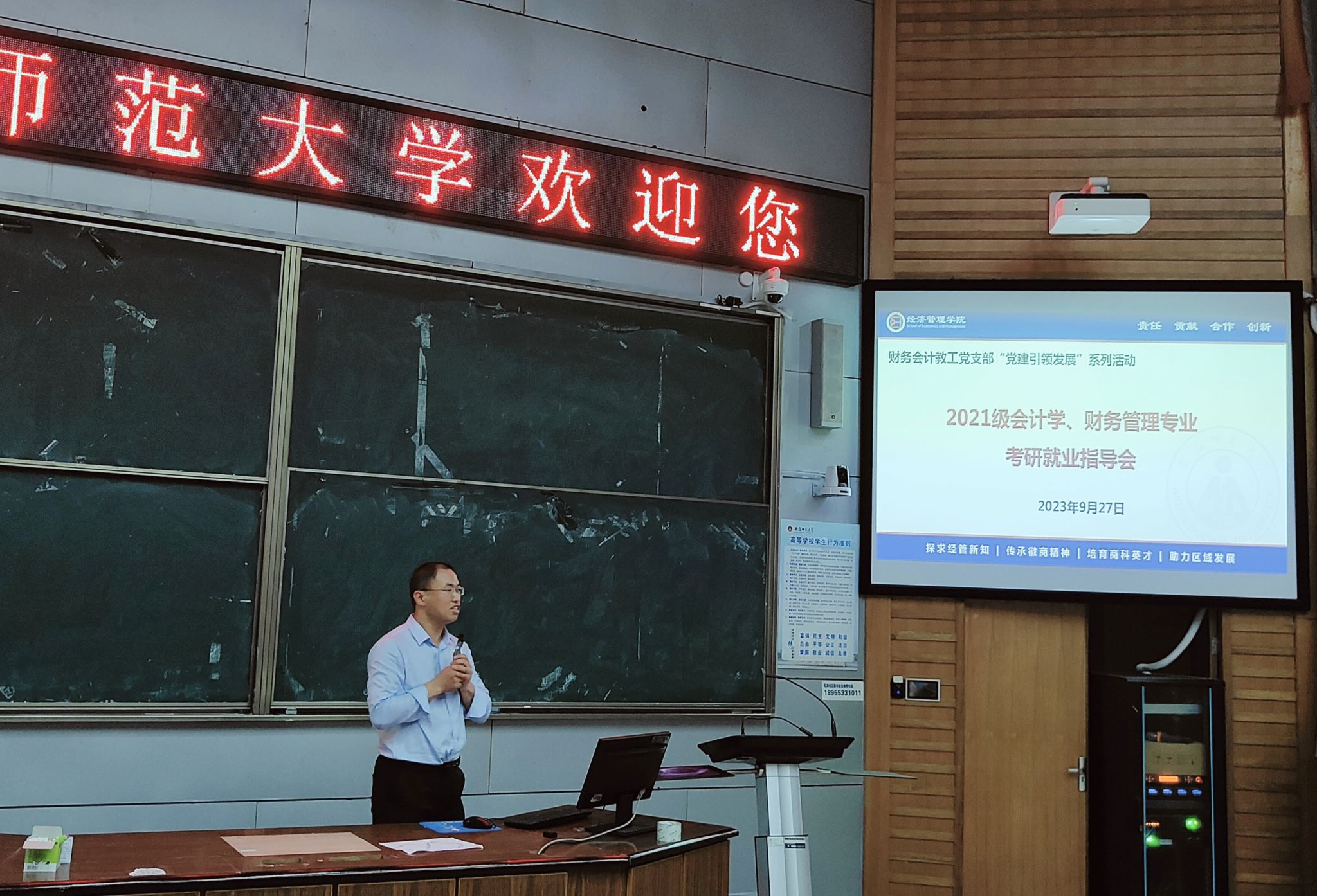 9月27日下午18:30,财务会计教工党支部在教学楼1号楼105教室开展“党建引领发展”系列活动暨2021级会计学、财务管理专业考研就业指导会,由财务会计教工党支部书记徐飞,财务会计系系主任高智林主讲,会议由辅导员刘胡海主持。