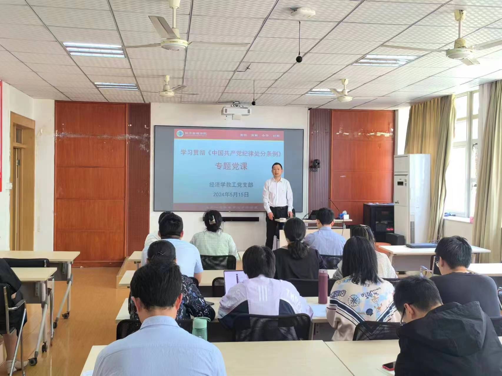 5月15日下午,经济学教工党支部在公司112会议室开展党纪学习教育专题学习研讨活动。支部书记刘树利主讲党纪学习教育专题党课,就学习贯彻《中国共产党纪律处分条例》进行了解读,并组织教师党员开展学习研讨。