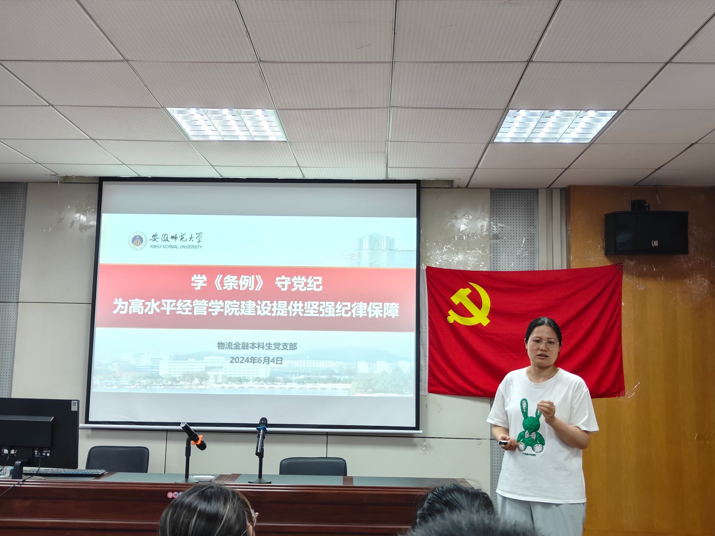 为进一步提高党性修养,增强纪律意识,6月5日下午,物流金融本科生党支部书记盛亚琴在公司二楼报告厅讲授党纪学习教育专题党课,支部全体党员现场聆听。