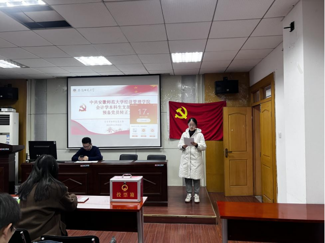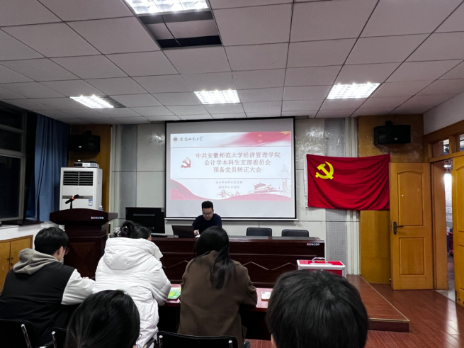 11月29日晚,会计学本科生党支部预备党员转正大会在公司二楼报告厅顺利举行,会议由支部书记刘胡海主持。