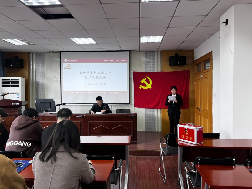 3月19日下午,m88官网会计学本科生党支部在公司二楼报告厅召开2025年第一批次发展党员支部大会,讨论吸收刘忠乐、张晨为中共预备党员相关事宜。此次会议由党支部书记刘胡海主持。