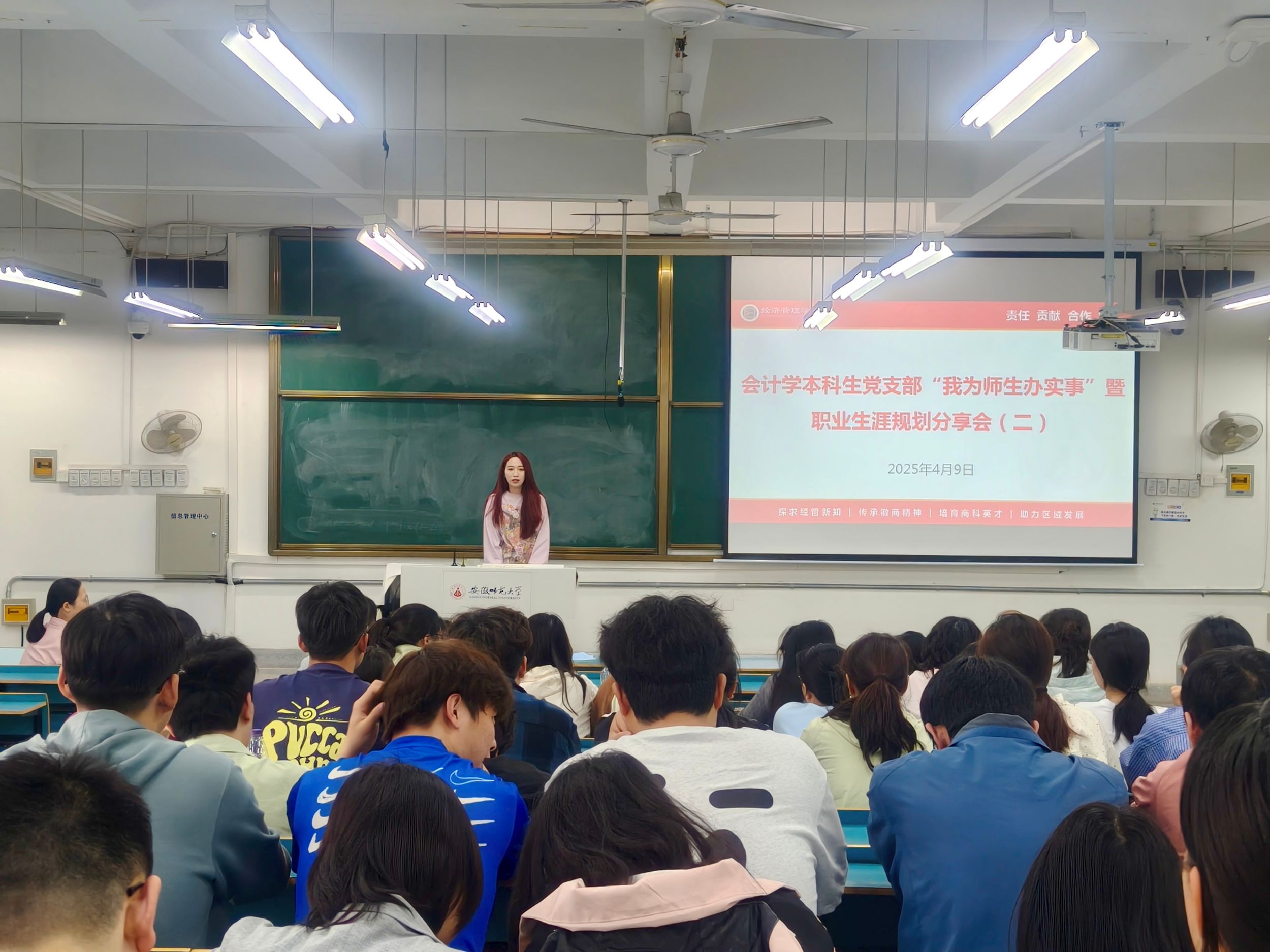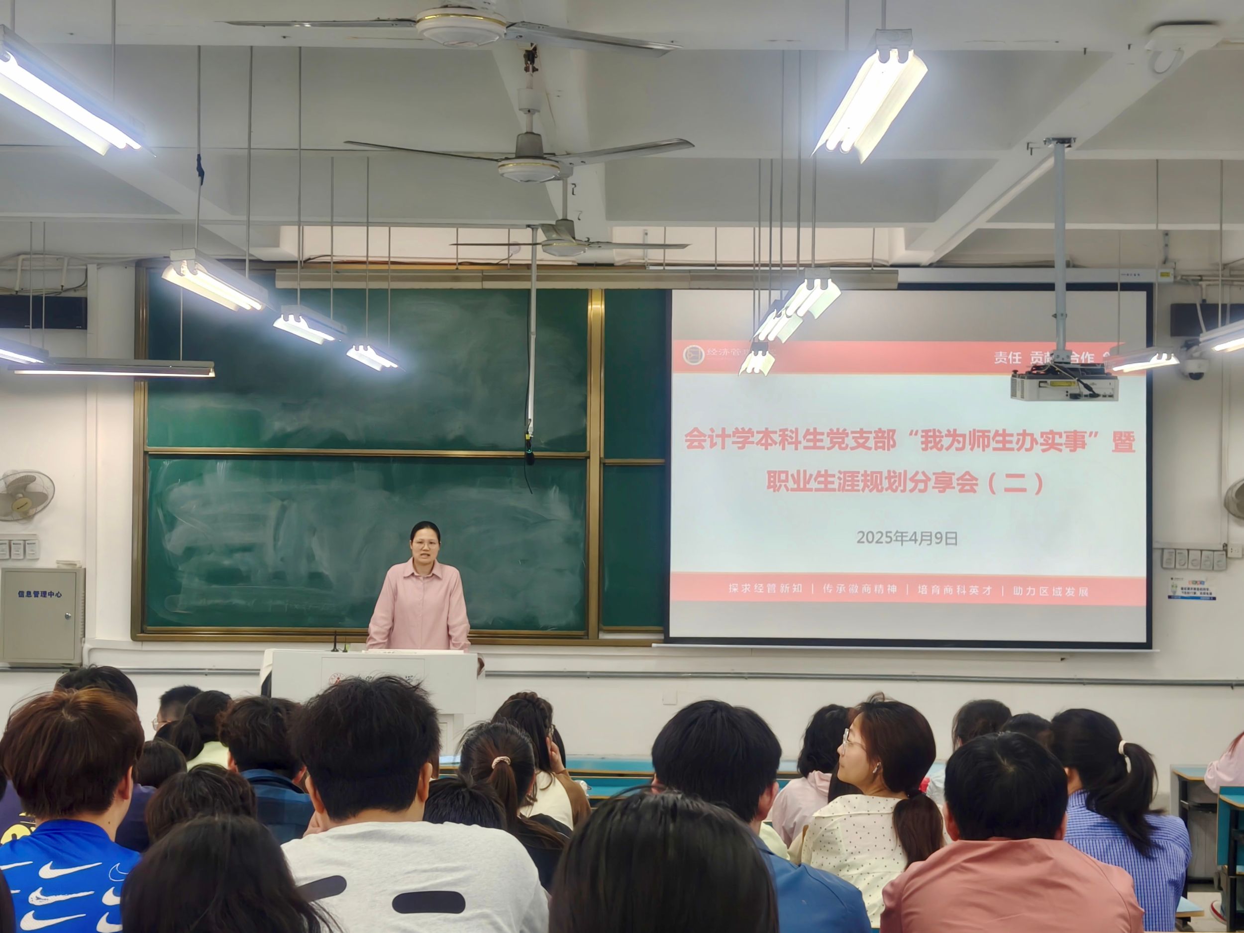 2025年4月9日下午,会计学本科生党支部于行知楼2070201教室召开第二期“我为师生办实事”暨员工职业生涯规划分享会。会议由辅导员盛亚琴主持,2022级财务管理、会计学专业全体员工参会。活动聚焦职业规划、就业指导与升学备考,邀请2021级优秀员工代表分享经验,为低年级学子提供实践参考与未来方向指引。