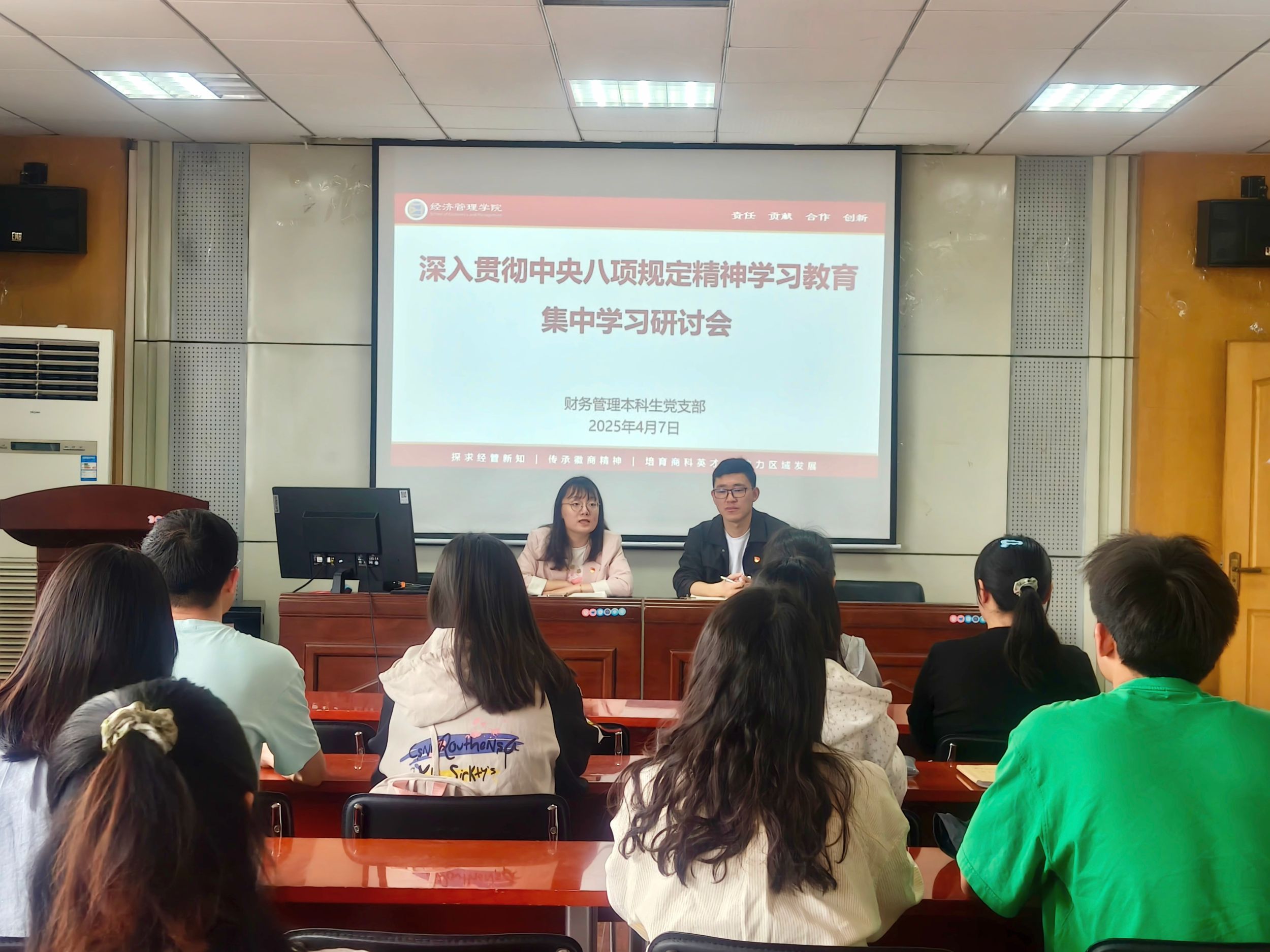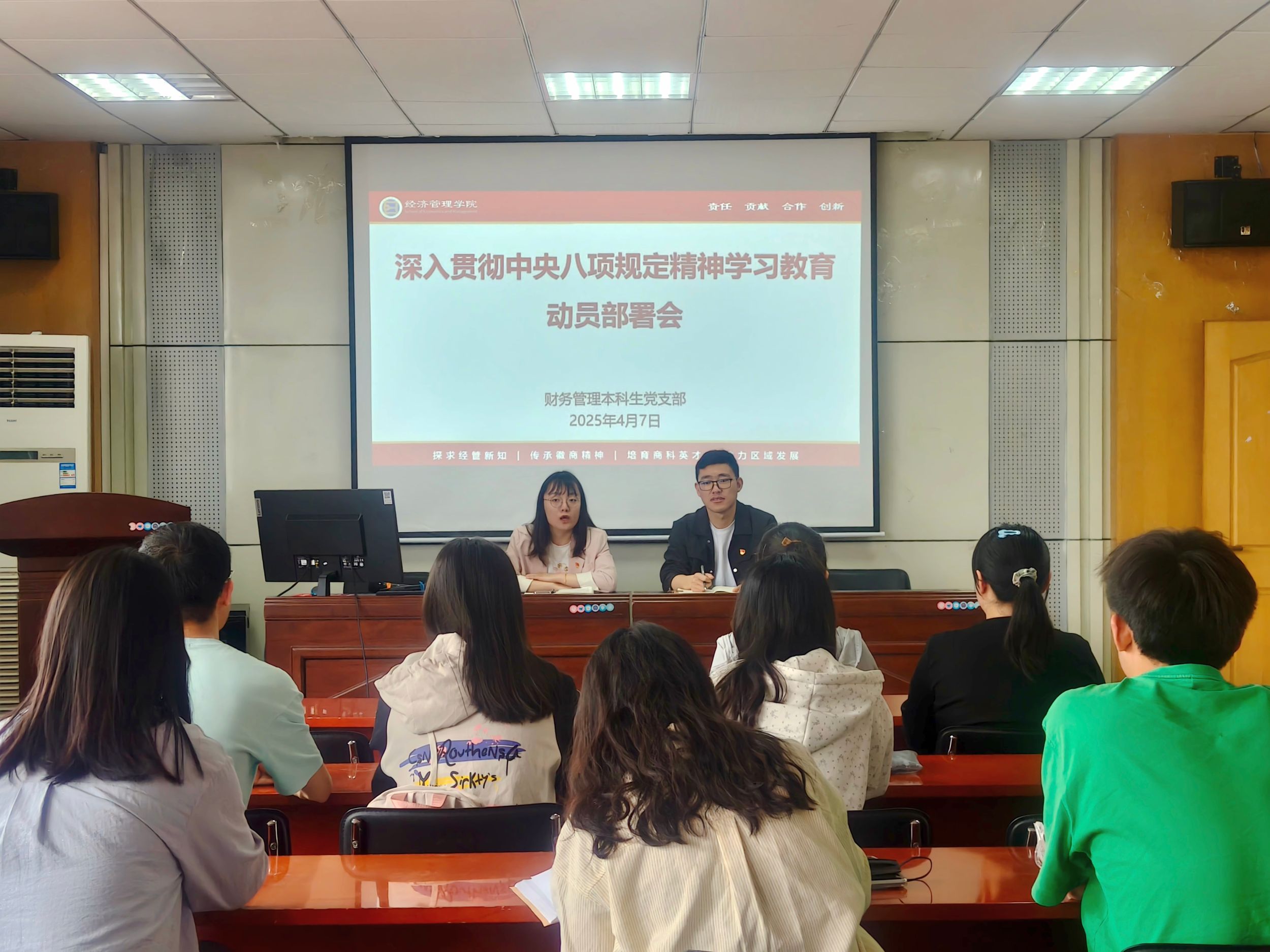 4月7日上午,财务管理本科生党支部在公司二楼报告厅召开深入贯彻中央八项规定精神学习教育动员部署会。会议由支部书记李佳颖主持,支部全体党员参会。