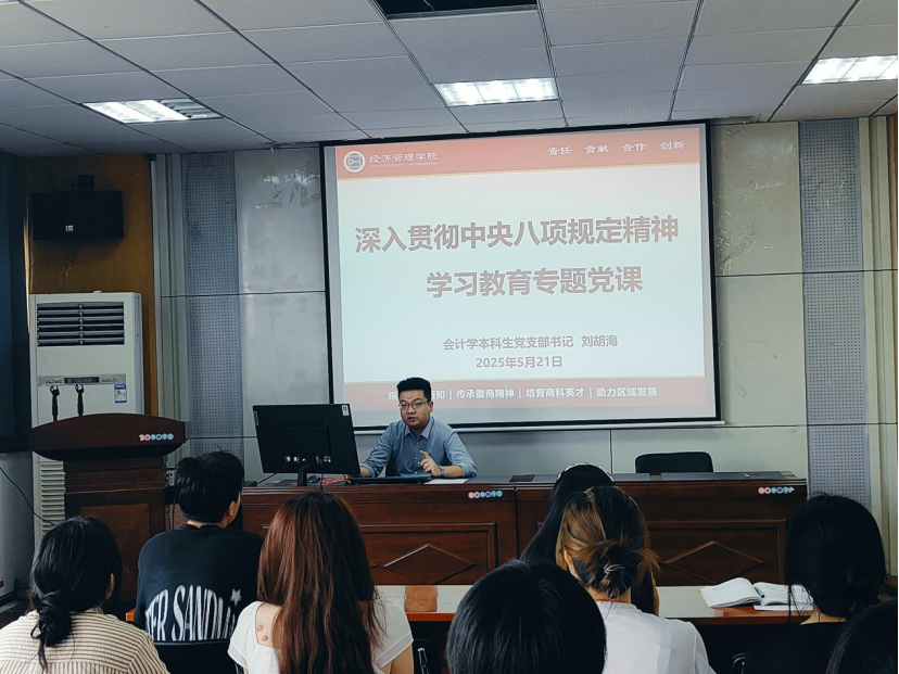 5月21日,会计学本科生党支部开展了主题为“深入贯彻中央八项规定精神学习教育”的专题党课。此次党课旨在深入学习贯彻中央八项规定精神,强化员工党员的纪律意识和规矩意识,发挥党员的先锋模范作用。专题党课由支部书记刘胡海主讲。