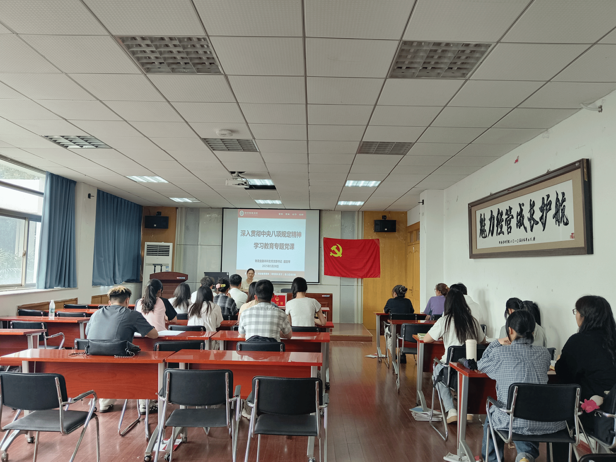 为进一步推动理论学习,切实加强党性修养,5月28日下午,物流金融本科生党支部在m88官网二楼报告厅组织开展“学习八项规定 勇担时代使命”专题党课和集中学习研讨活动,党课由支部书记盛亚琴主讲,全体党员积极参与集中研讨。