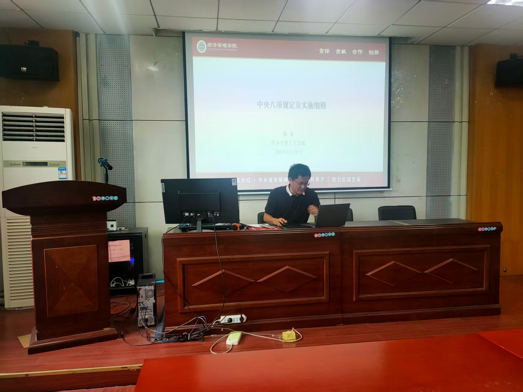 6月20日,经济学教工党支部在公司二楼报告厅召开学习领会和贯彻执行中央八项规定及其实施细则精神专题党课。本次党课由党支部书记陈龙副教授主讲,支部全体党员参加。