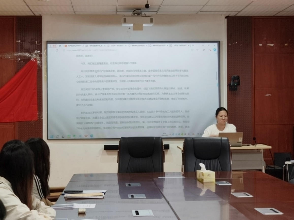 在迎“七一”主题党日活动中,盛亚琴带领与会党员集中学习了习近平总书记在纪念陈云同志诞辰120周年座谈会上的讲话,系统介绍了陈云为党和人民事业作出的卓越贡献。她强调,青年党员要将学习陈云同志宝贵精神财富与深化伟大建党精神理解相结合,从严要求自身,切实把先锋模范作用体现在日常学习、工作和即将面临的就业实践中,以扎实行动践行党员责任与担当。
