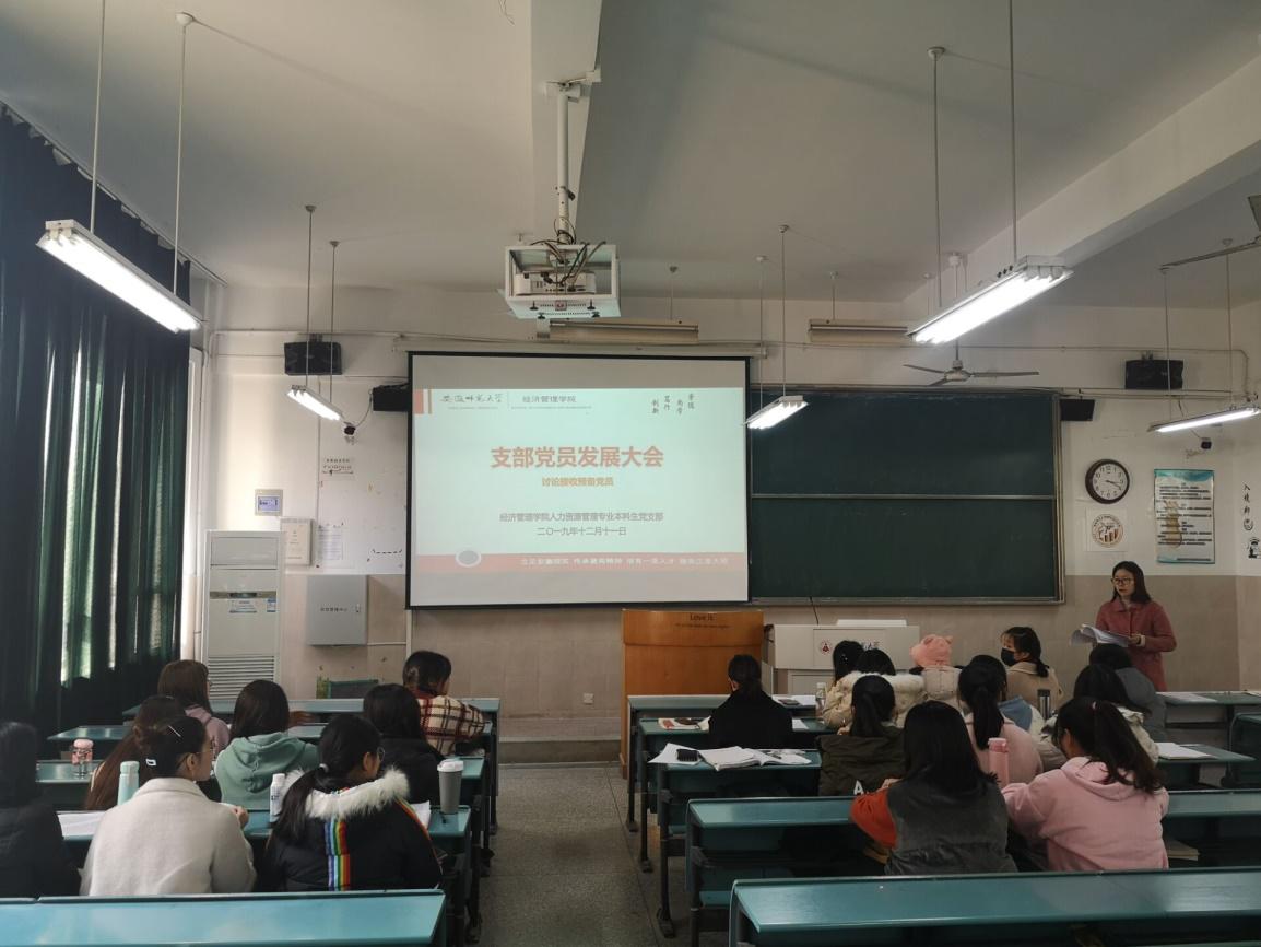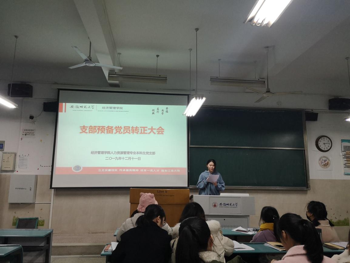 2019年12月11日下午15:00,人力资源管理专业本科生党支部在行知楼2020202教室召开接收预备党员暨预备党员转正大会,党支部正式党员、预备党员以及拟被组织吸收为预备党员的入党积极分子参加了此次会议,会议由党支部书记吴敬之主持。