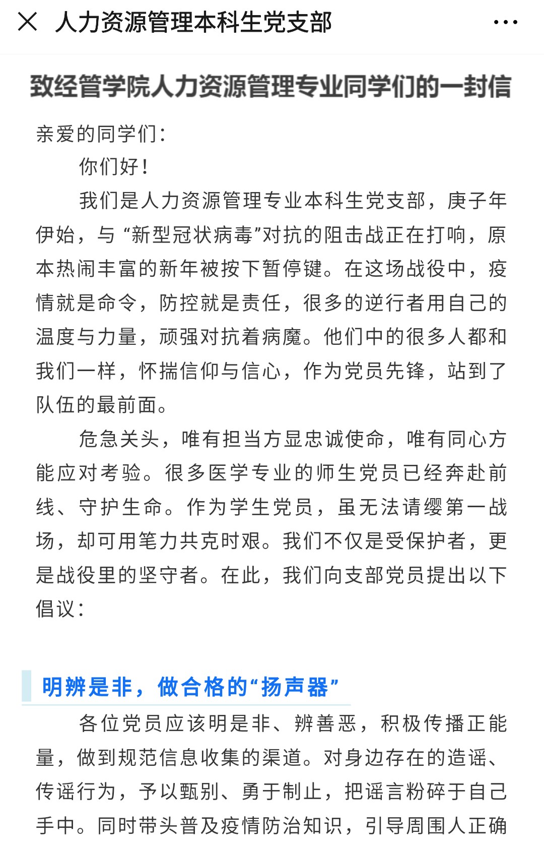 通过发布《致m88官网人力资源管理专业同学们的一封信》,倡导人力资源管理学子在疫情期间“明辨是非,做合格的扬声器”、“尊法守纪,做自觉的践行者”、“惜时读书,做勤奋的优等生”,用实际行动为防疫工作做出自己力所能及的贡献。