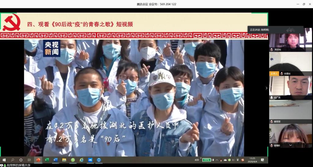 全体党员还观看了讲述身处抗疫一线“90后”典型人物故事的《90后战“疫”的青春之歌》和《习近平致敬的战“疫”英雄 | 幸得有你民安泰来》短视频,并先后分享了舍己为人的武汉公交司机聂三华和大疫当前勇敢担当的“90后”好村干韩世磊等先进抗疫事迹。各位党员依次结合战“疫”英雄们的先进事迹以及自己在这场防疫阻击战中的所见所闻谈了自己的感想,共同向战“疫”英雄们致敬。