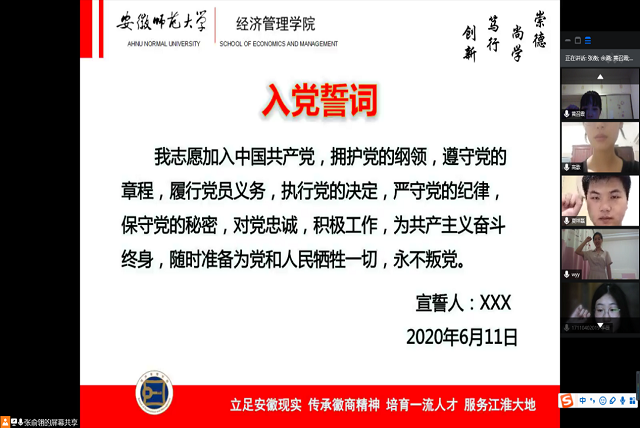 会议第二项,为引导毕业生党员提高党员意识,能够时刻铭记党员身份,增强党性修养,牢记宗旨使命,做文明离校的表率,支部全体成员齐唱国歌后,由支部成员程妍同志带领大家以饱满的热情重温了入党誓词。最后,为引导毕业生党员站好最后一班岗,为低年级同学做榜样,充分发挥先锋模范作用,支部内就学期新阶段的考研、保研、就业三大类问题进行了提问交流,张衡、朱慧云、吴瑶瑶等同学就考研的不同专业、不同阶段的学习实践经历进行了详细分享,余潞、何丽君、谢依欣等同学就保研的不同方式、各个阶段要点均囊括分享给支部低年级同学,程妍同学提议后期毕业生党员可以联系优秀学长学姐为低年级同学专门组织召开学习交流会,分享关于考研就业的成长经历和经验。