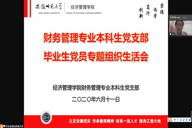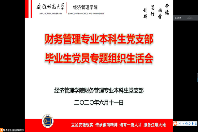 本网讯(财务管理专业本科生党支部 文/张俞翎 图/陈露露)2020年6月11日晚,m88官网财务管理专业本科生党支部于腾讯会议召开毕业生党员专题组织生活会,财务管理党支部全体成员参会,会议由支部成员张俞翎主持。
