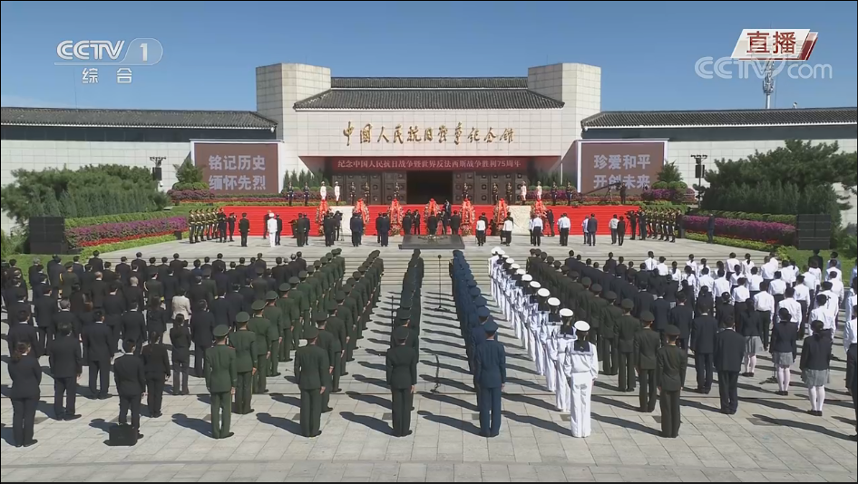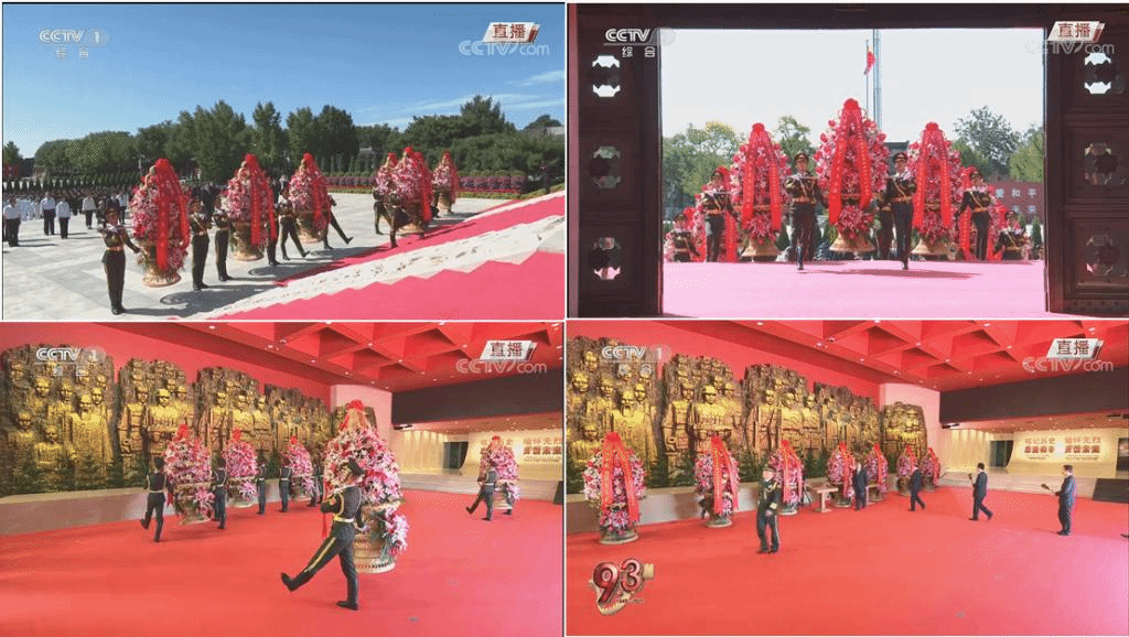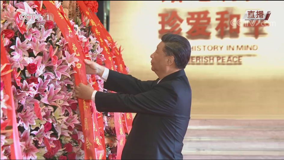 10时整,向抗战烈士敬献花篮仪式在雄壮的国歌声中开始。国歌唱毕,全场肃立,向在中国人民抗日战争中英勇牺牲的烈士默哀。默哀毕,军乐团奏响深情的《献花曲》,14名礼兵抬起7个花篮,缓缓走进中国人民抗日战争纪念馆序厅,将花篮摆放在象征中华民族团结抗战的大型浮雕《铜墙铁壁》前。习近平等缓步登上台阶,走进纪念馆序厅,在花篮前驻足凝视,表达对抗战烈士的深切缅怀和崇高敬意。之后,习近平迈步上前,仔细整理花篮上的缎带。随后,其他领导同志和各界代表依次进入纪念馆序厅献花。