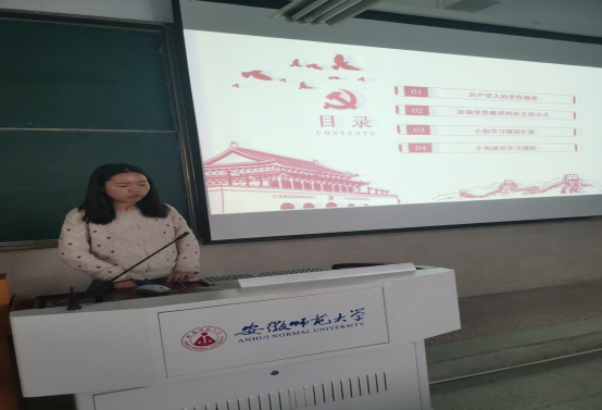 第四小组分享了对于青年党员党性修养的理解与感悟,指出党性修养是党员的品质修养,党员在不同的人生时期的党性修养既有共性也有个性,党性修养既包括政治理论修养、组织纪律修养、思想作风修养,也包括文化知识修养、领导艺术修养、管理能力修养、共产主义道德修养,党员的党性锻炼不是一朝一夕的事,要有一个长期磨练的过程。事物总是发展变化的,人也是这样,今天符合党员标准,有较强的党性,如果一旦放松对自己的要求和党性锻炼,不警惕资产阶级腐朽思想的侵蚀,就可能犯错误。