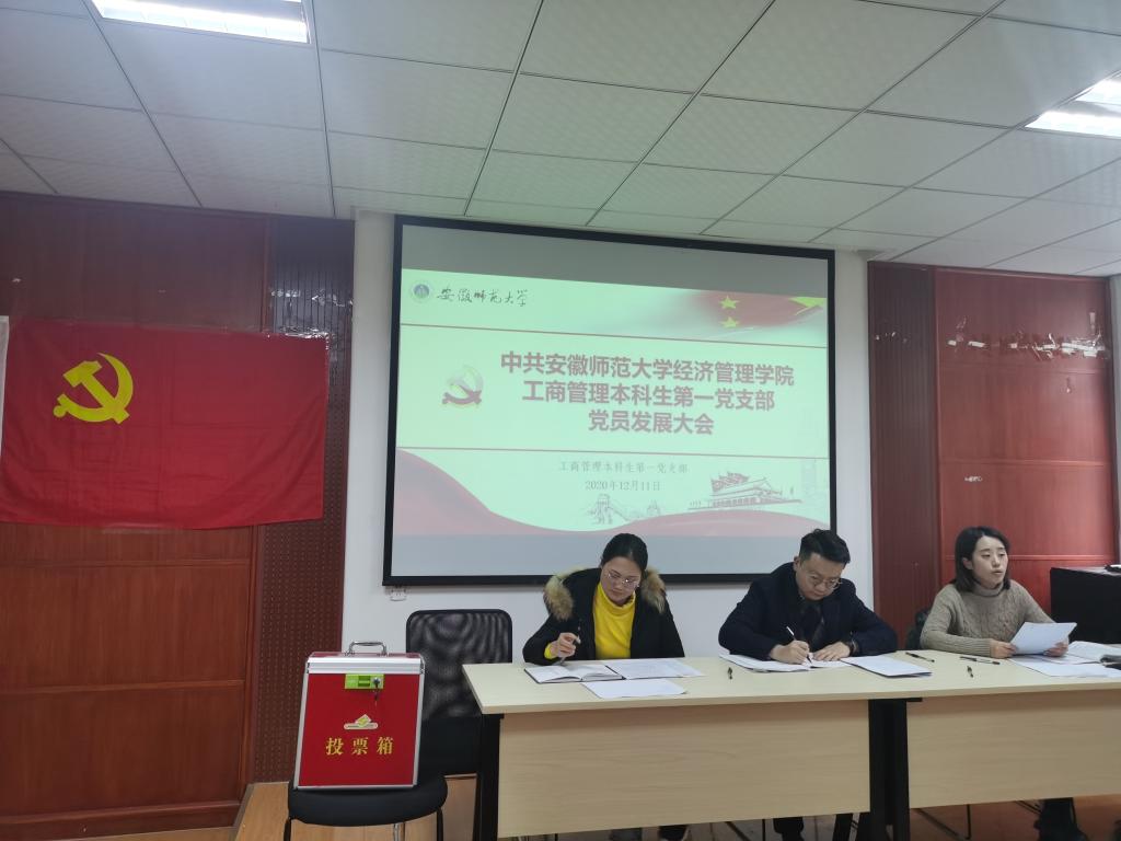 本网讯(工商管理本科生第一党支部文/唐晓熠 图/王璐瑶)2020年12月11日下午14时30分,m88官网工商管理本科生第一党支部在院行政楼党员电教化中心召开今年第二批次党员组织发展支部大会,讨论接收曹晨等17名同志发展为中共预备党员的问题。公司党委委员、党委副书记李海燕老师列席本次会议,由党支部书记刘胡海老师主持,党支部副书记盛亚琴老师以及于琼老师参加此次会议。