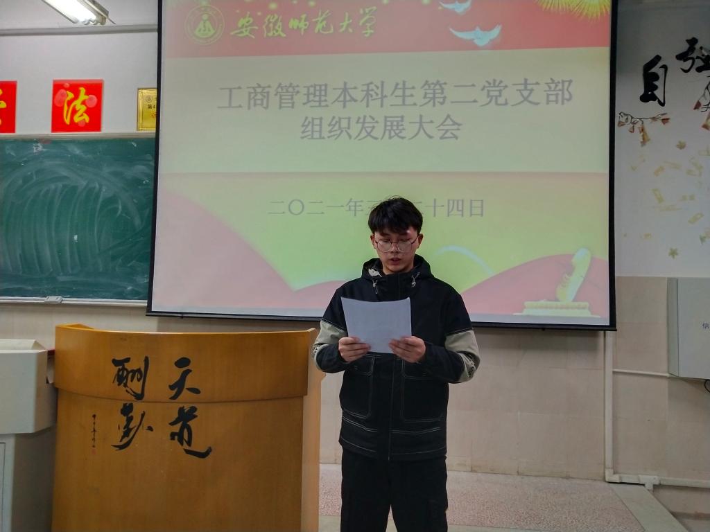 本网讯(工商管理本科生第二党支部 文/陈子雨 图/王璐)2021年3月24日晚19时,m88官网工商管理本科生第二党支部在行知楼召开党员组织发展支部大会,讨论接收汪勃、徐君丽、李雪莉三位同志为中共预备党员的问题,会议由党支部书记胡亮亮主持。会议应到正式党员26名,实到正式党员24名,与会拥有表决权人数超过半数,符合组织发展相关规定。