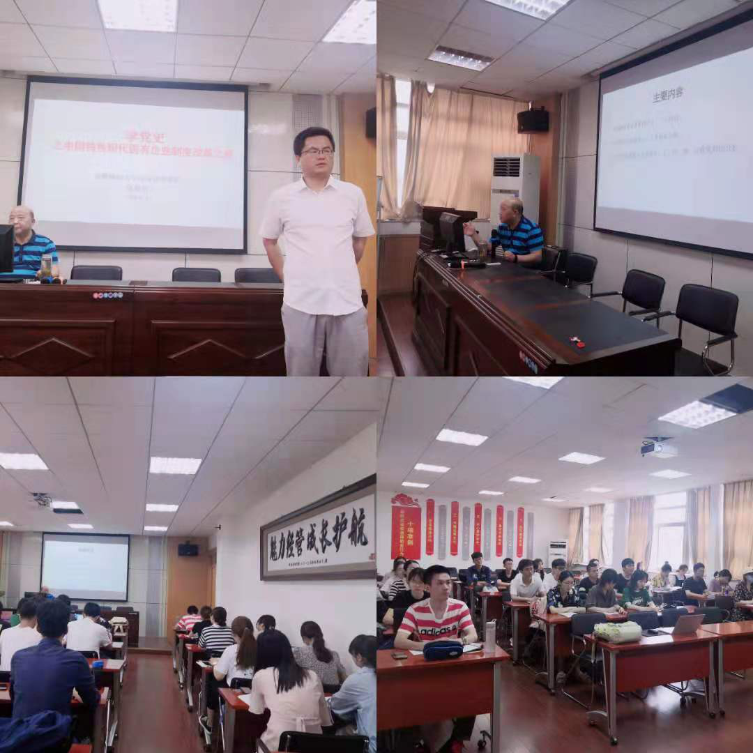 党课开始前,支部书记陈龙对伍老师进行了介绍,大家热烈欢迎伍老师的讲课。伍老师此次党课主要分为以下几个部分:中国国有企业改革四十年:三大阶段;中国特色公司治理:六大主体怎么做;国企党委前置研究事项清单:京、苏、浙、辽政策对比分析。其中伍老师提到六大主体改革主要从以下六个方面开展,其一要毫不动摇地坚持党组织领导:关键是将法制化、程序化融入公司治理,其二对于董事会决策:要落实职权,提升决策能力,其三是经理层执行要激发活力,保证行权履职,其四是股东会要优化,力推国有股东管控方式升级,其五是将董事会放大,建立大监督体系,最后是要保证职代会健全,做到要巩固和创新职工民主管理方式。