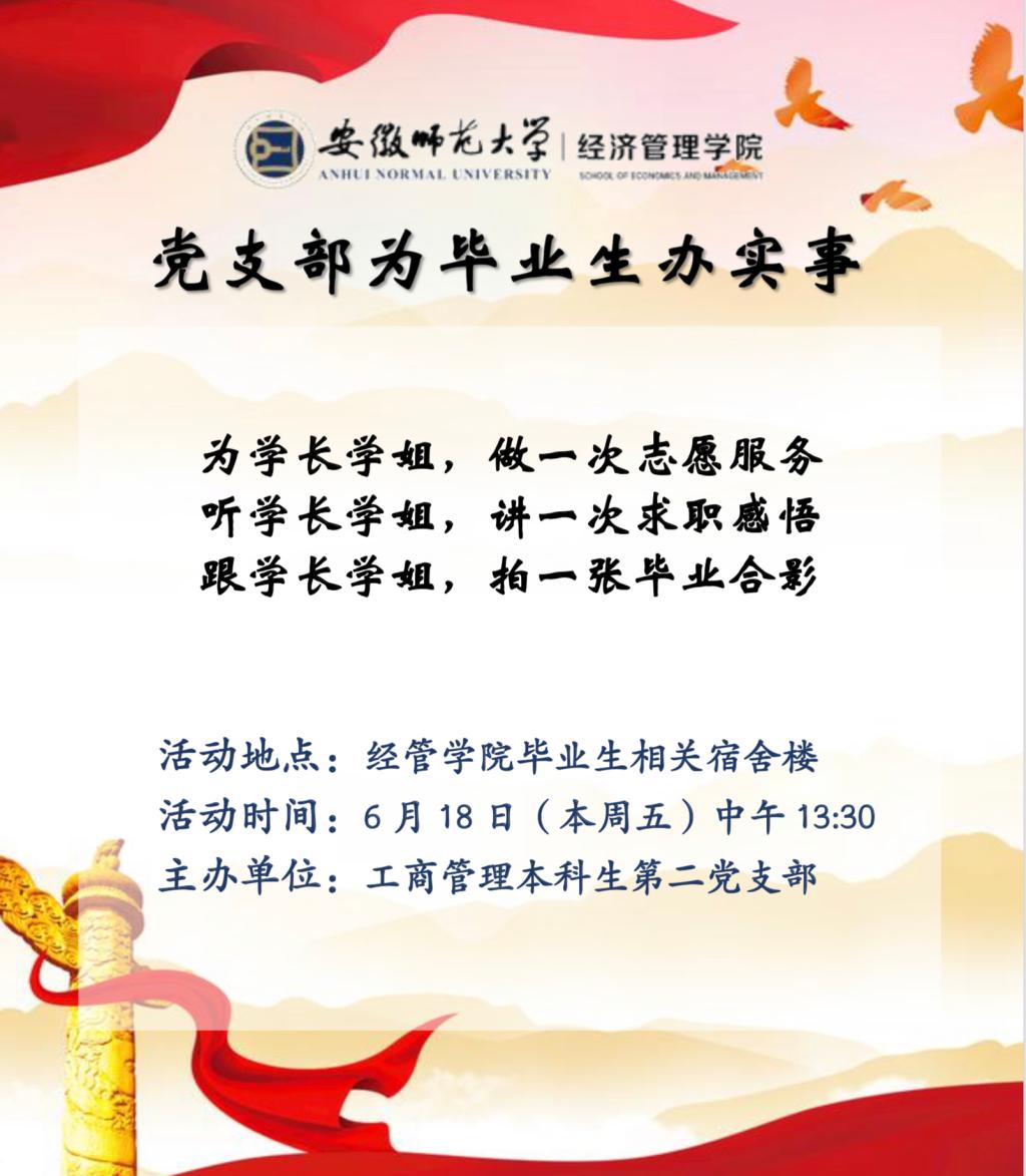 本网讯(工商管理本科生第二党支部 文/许欢 图/王璐)随着毕业季的来临,为进一步推进党支部建设,促进新老生交流,加强与毕业班党员同学的联系,工商管理本科生第二党支部于6月18日下午进行“党支部为毕业生办实事”活动,本次活动围绕“为学长学姐,做一志愿服务”、“听学长学姐,讲一次求职感悟”、“跟学长学姐,拍一张毕业合影”为主要内容。