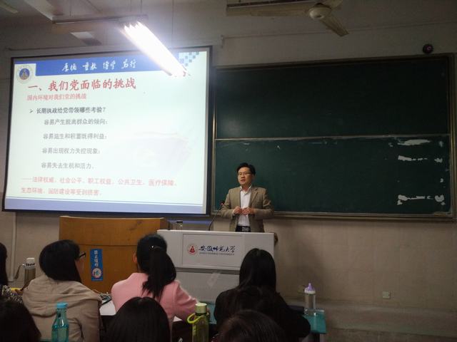 谢超峰首先以近几年的时事新闻为背景,带领培训班学员了解我国现在面临的国内国外的多重挑战。他指出,作为一个长期执政党,共产党不仅面临干部群众、基层党组织的党风廉政建设等内部挑战,还面临着资本主义强国以及周边国家的威胁。随后,谢超峰以时事背景为出发点,以理论学习为主线,带领学员们共同学习了包括马克思列宁主义、毛泽东思想、中国特色社会主义理论体系、“三个代表”重要思想、科学发展观等思想理论在内的中国共产党的指导思想。最后,谢老师提出要以“真学、真懂、真信、真用”的态度学习、践行和坚持党的指导思想。他希望同学们将中国共产党的指导思想内化为自己的处事标杆和行为准则,向成长为合格的共产主义接班人这一目标而前进。