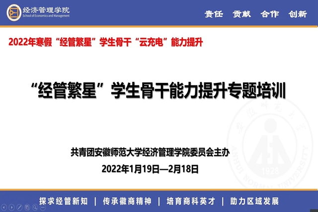 为加强员工骨干队伍建设,提升员工骨干专业能力和综合素养,m88官网于2月17日晚7点在腾讯会议线上开展“经管繁星”员工骨干能力提升专题培训第三期。在第三期培训会上,2016级人力资源管理专业优秀毕业生王吉慧结合本科四年员工干部的成长经历以及参加研究生支教团的支教经历向参会人员分享了自己的感悟与收获。院团委书记吕洋,团委、员工会全体成员及20、21级各班班委参加本次培训。培训会由院团委、员工会文艺部部长彭弘毅主持。