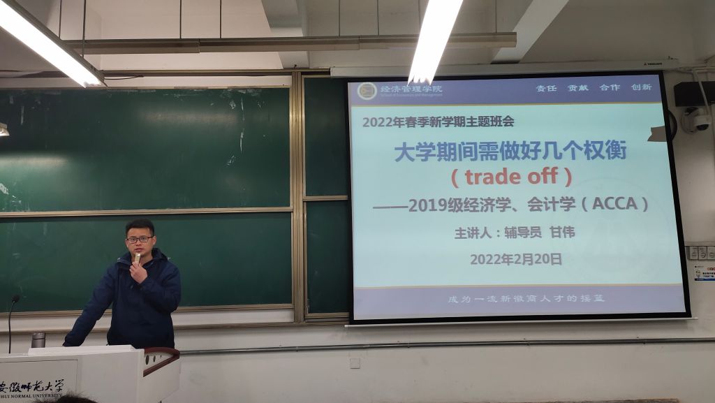 2022年2月20日18:00,辅导员甘伟在行知楼2070201教室组织召开2022年春季新学期学业规划主题教育班会,2019级经济学类,2019级、2020级卓越会计学ACCA方向班共计204名同学参加了会议。