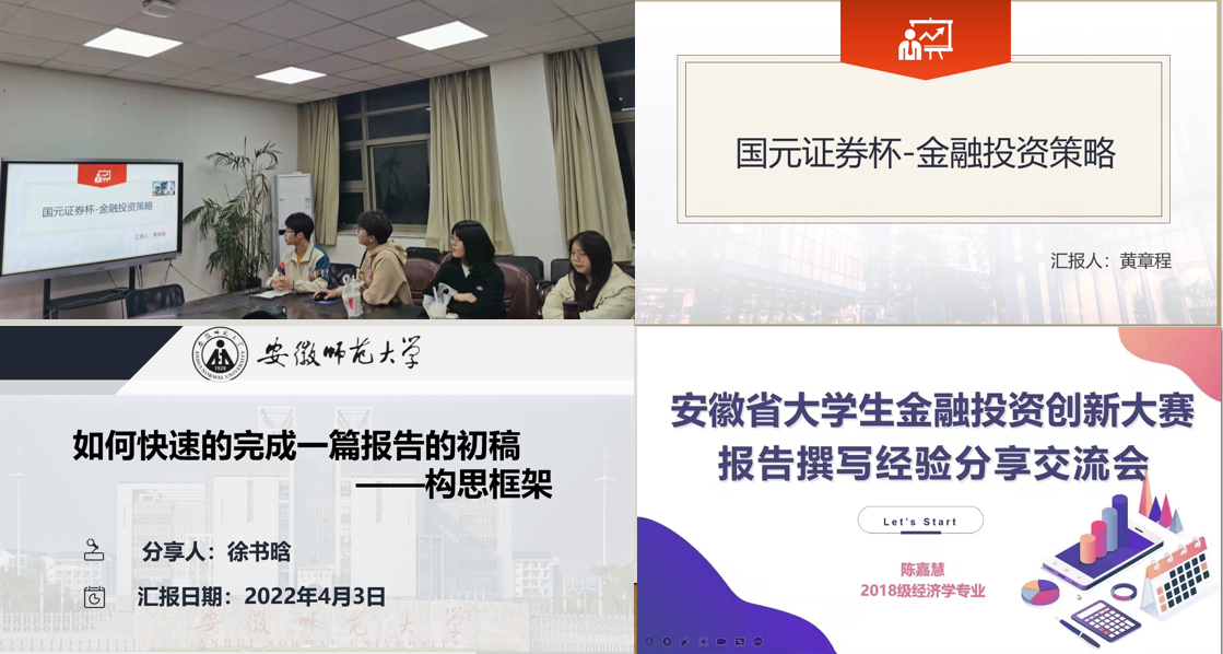 为了培养老员工对金融投资等方面的兴趣,激励更多的老员工参加学科竞赛,帮助同学们积极备战“国元证券杯”大赛,4月3日晚,“国元证券杯”老员工金融投资创新大赛经验分享交流会通过腾讯会议形式召开。往届大赛获奖者2018级投资学黄章程、2018级经济学陈嘉慧、2018级ACCA王玲丽、2019级金融工程徐书晗与大家分享参赛过程及心得体会,并就比赛流程和规则,注意事项进行了必要的提示。会议由经济学会会长徐钱磊主持。
