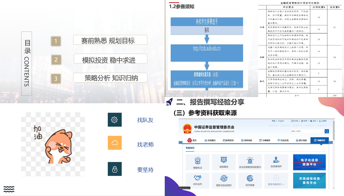 黄章程同学分享了他在股票交易和金融投资策略方面的经验,他从赛前准备,再到投资、操作策略,最后根据策略进行分析,完整地、全面地讲述了他在比赛当中的心路历程。徐书晗同学参加的类型也是股票交易和金融投资策略,因为前面黄同学已经分享了整个比赛的框架,所以徐同学把侧重点更多地放在报告初稿上。徐同学最后还特别在找队友、找老师方面给出了自己的建议。在找队友方面,不能用人与人之间关系的好坏作为找队友的标准;在比赛的过程中,要多主动找老师交流,每一位老师都会尽自己所能地帮助同学们解决比赛中的问题。
