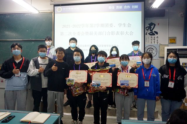 紧接着进行了“最美部门合影”表彰大会。由新媒体运营部部长张青云对评比结果进行公布,并宣布本次活动圆满结束。获奖部门代表上台发表获奖感言后,由院团委书记吕洋和主席团成员为获奖部门颁布获奖证书和奖品。