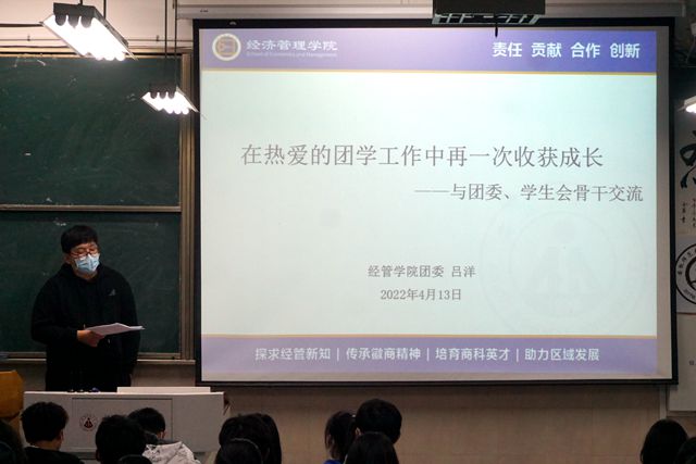 最后,院团委书记吕洋进行总结发言。院团委书记吕洋总结了历年来团委、员工会工作的特点,强调员工会工作重在传承。团委、员工会是在以年为单位的工作中不断送别和迎新,在一届届员工干部的接续努力下实现制度、文化、能力的不断提升。吕洋也指出了团委、员工会成员在日常工作中要加强统筹能力,强化补位意识,提高组织战斗力,建设一支敢想敢做的员工队伍。