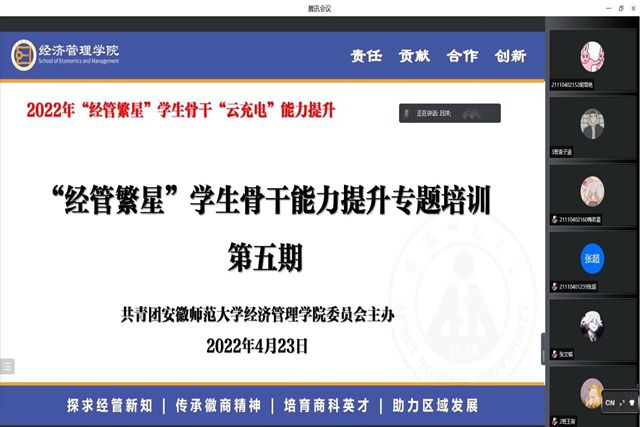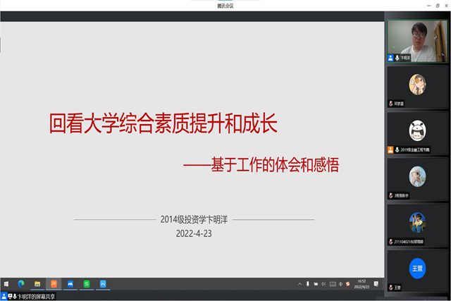为提升员工骨干专业能力和综合素养,实现员工“云”充电,4月23日下午4点,m88官网在腾讯会议线上开展“经管繁星”员工骨干能力提升专题培训第五期。本期主讲人是2014级投资学优秀毕业生卞明洋,院团委书记吕洋,团委、员工会全体成员及各班班委参加本次培训,培训会由员工会主席韦魏主持。