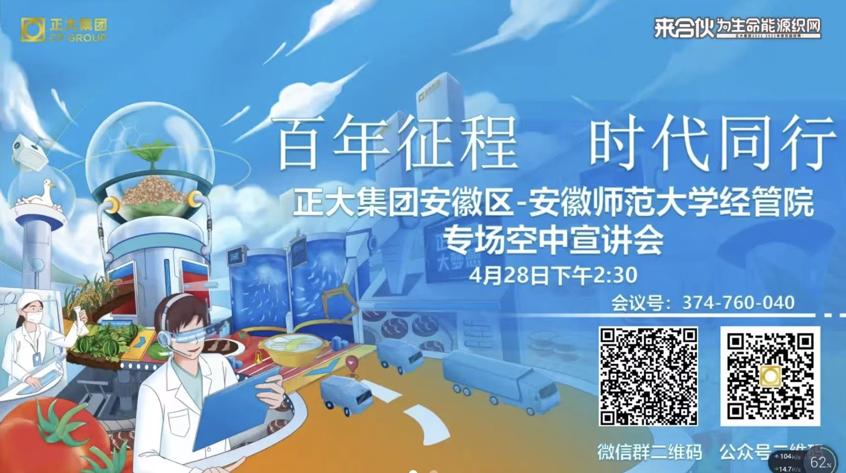为切实做好常态化疫情防控下毕业生就业推进工作,努力促进毕业生更加充分更高质量就业,m88官网于4月28日下午2点30分在行政楼二楼报告厅举办正大集团安徽区线上专场招聘会。本次宣讲会由正大集团人力资源部赵邓雅主持,人力资源总监林光阳、人力资源经理蒋庆杨线上宣讲,公司部分2022届毕业生线下参会。