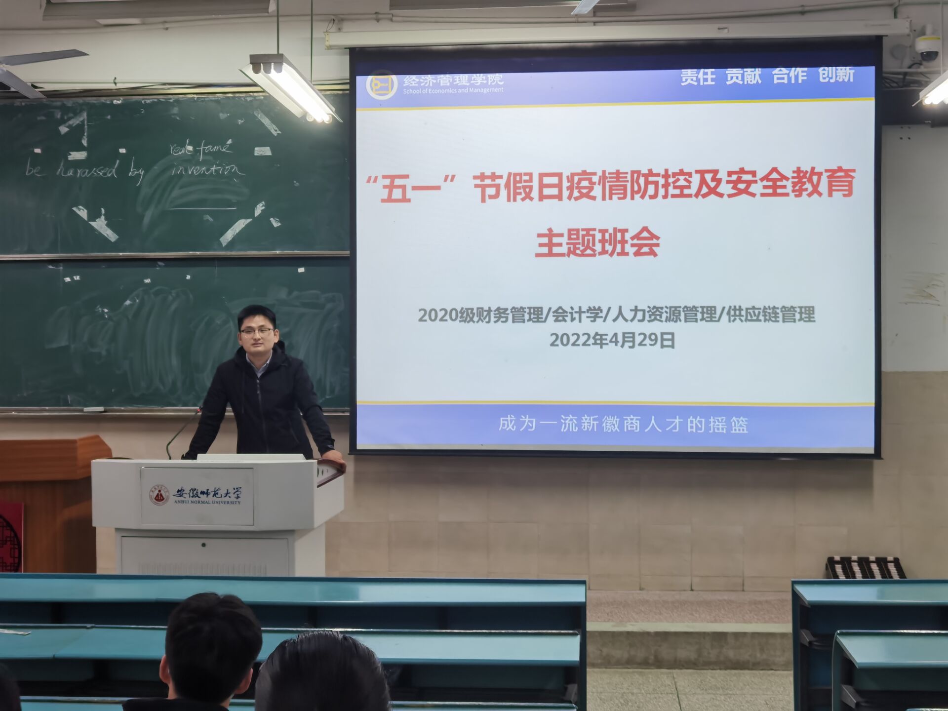 为了提高同学们的疫情防控及安全防范意识,2022年4月29日,2020级工商管理类分别于教学楼2070101、2040102分批次开展疫情防控及安全教育主题班会。会议由辅导员胡亮亮主持,20级会计学、财务管理、供应链管理、人力资源管理专业全体同学参加会议。
