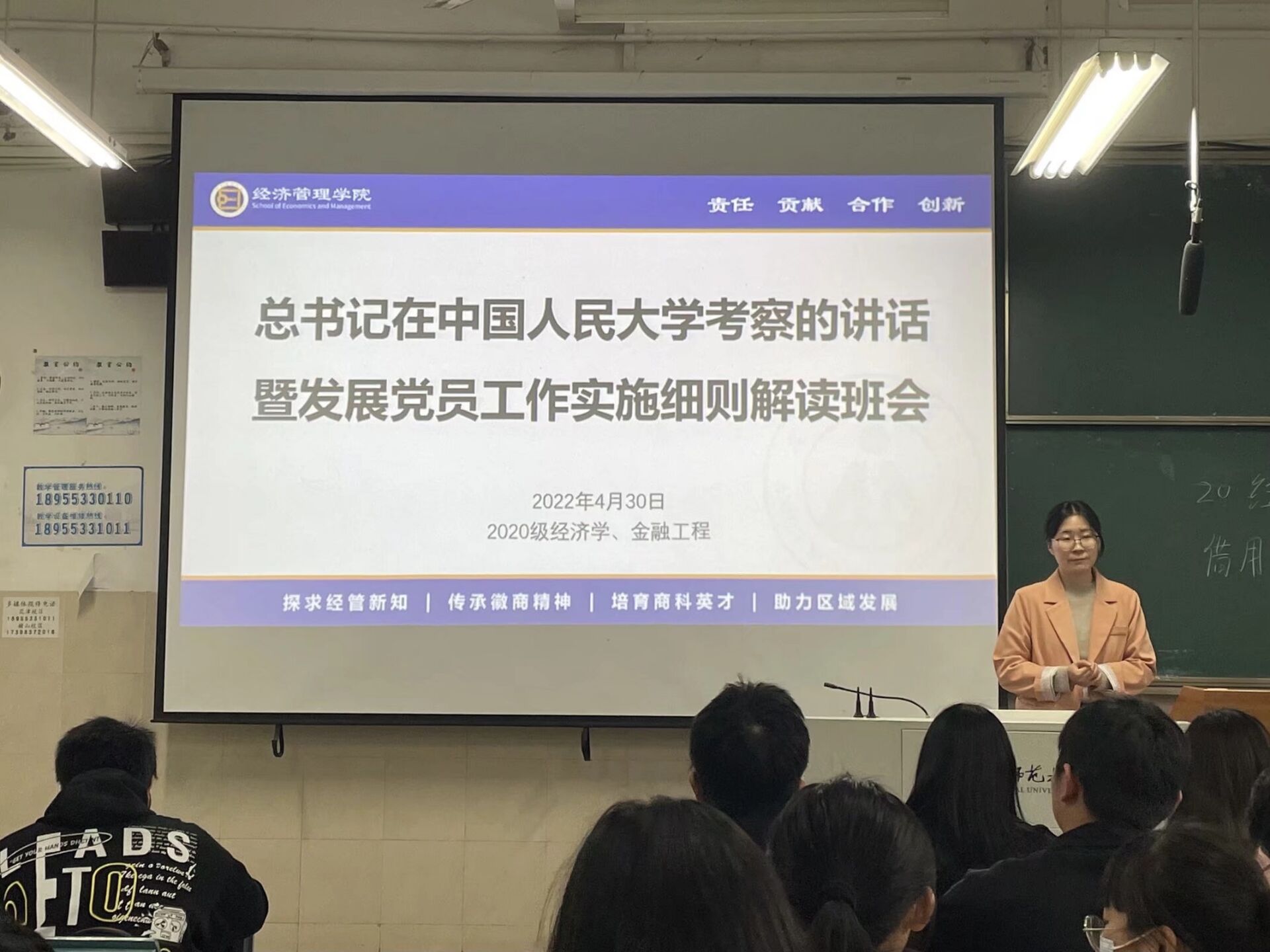 为贯彻习近平在中国人民大学重要讲话精神和近期班级即将开展的发展党员工作做准备,吴敬之辅导员特于4月30日下午召开学习习近平总书记在中国人民大学考察时的重要讲话暨发展党员工作实施细则解读班会。