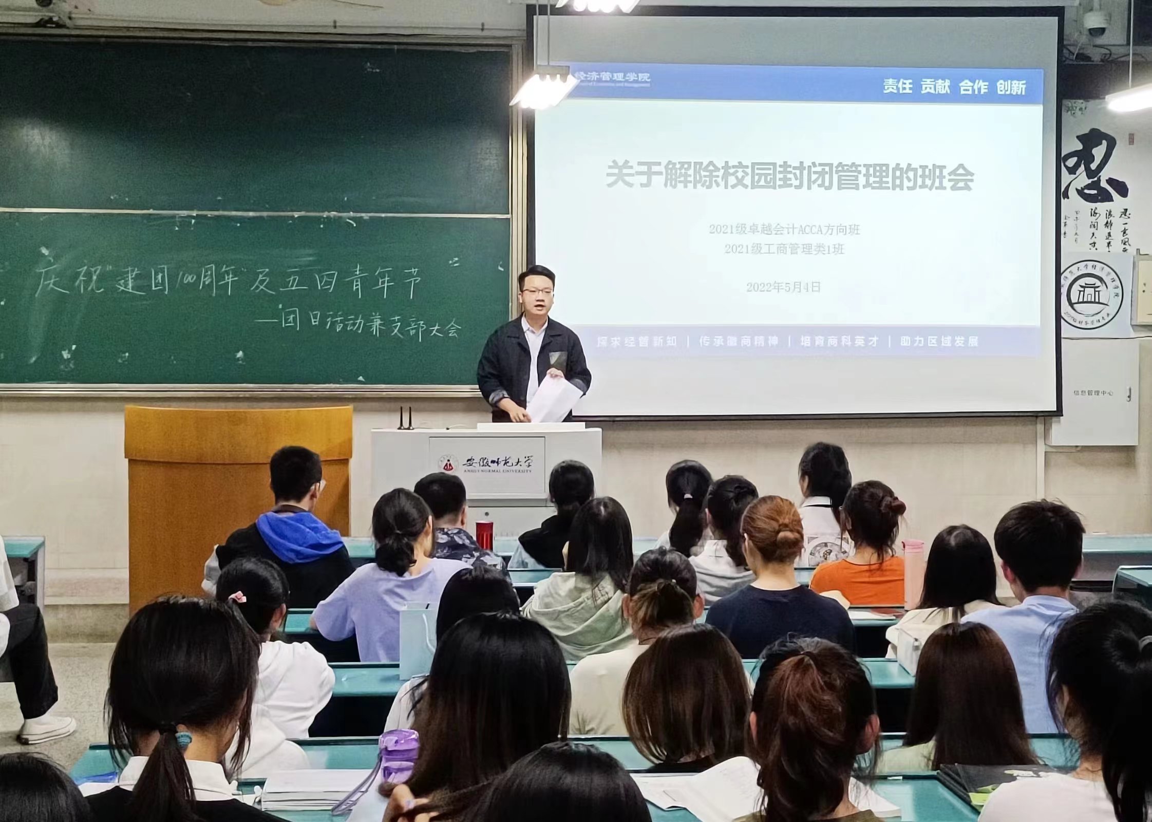 为落实公司关于疫情防控的进一步要求,继续巩固常态化疫情防控成果,2021年5月4日晚在教学楼2020101和2020301分别召开了《关于解除校园封闭管理》的班会,2021级工商管理类1、2、3班,卓越会计ACCA全体同学参加,由辅导员刘胡海主讲。