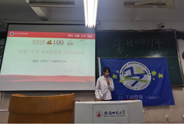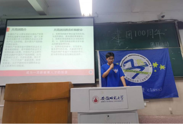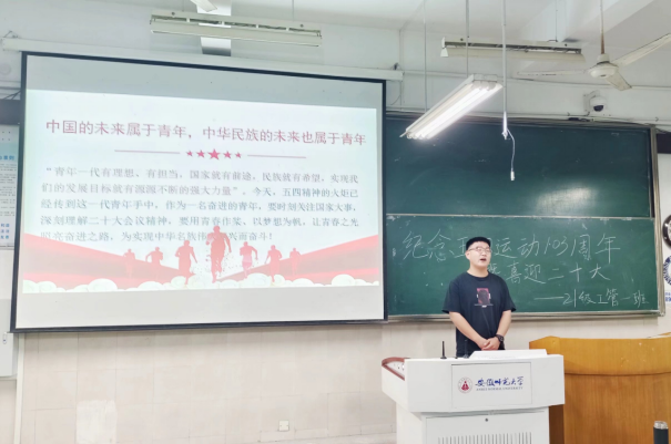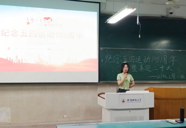 首先由主持人钟睿作开场致词,点明此次活动主题,宣布活动开始;接着由吕娟同学和尹凡同学上台依次讲学,针对五四精神及对喜迎二十大相关情况作了相关介绍,并呼吁同学们争做新时代有为青年。播放了庆祝中国共产主义青年团成立100周年宣传片《共青春》主题曲,旨在呼吁有梦则刚,初心不忘!其次主持人邀请“青马工程”学员班长石奥同学及团委委员邢乐凡同学上台发表活动后感悟;最后主持人作总结发言,并再次祝各位青年朋友们节日快乐,同时勉励同学们做有为新青年,奋进新时代!