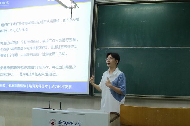会议伊始,主持人韦魏就“谜游花津”活动的具体规则和注意事项做出了详细的讲解和说明,提醒各位队长带领队员们积极参与活动完成任务的同时也要注意安全。接着,韦魏向各位队长展示了“谜游花津”的路线图,详细分析了在活动过程中如何以最高效率完成比赛,达到队伍预期成绩,并祝愿各队队伍能在活动中收获最好的成绩,遇见更好的自己。