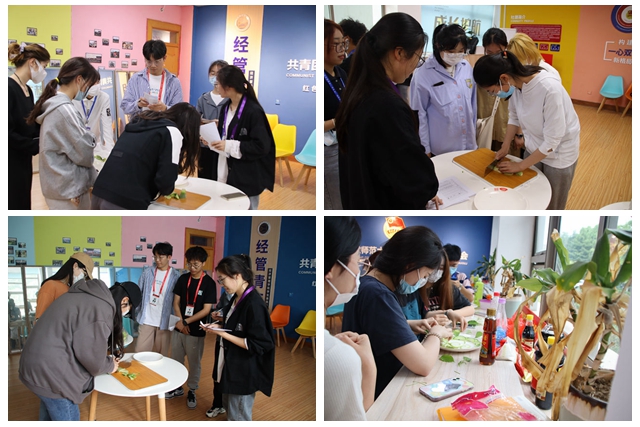 比赛分食材切片、美观摆盘和评委打分三个环节。活动伊始,在工作人员的引导下由各班级推选的90余支代表队依次进入荣誉室进行菜肴制作。参赛队员在团队成员的默契配合和员工会工作人员的指导帮助下,紧张却有节奏地进行菜肴的准备。经过参赛选手的精心制作,各参赛代表队呈现出色香俱全的精美菜肴,最终由团委、员工会主席团及生活权益部部长团组成评委团现场对菜品的色感、形感、香感、质感等方面进行打分。与此同时,每组队员在荣誉室的紧张制作吸引了一些同学,将活动气氛推向高潮。